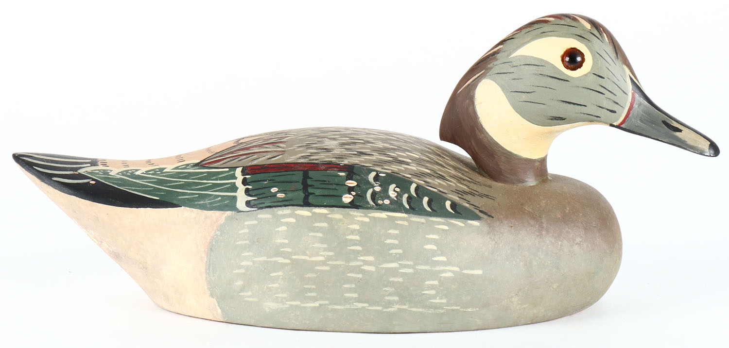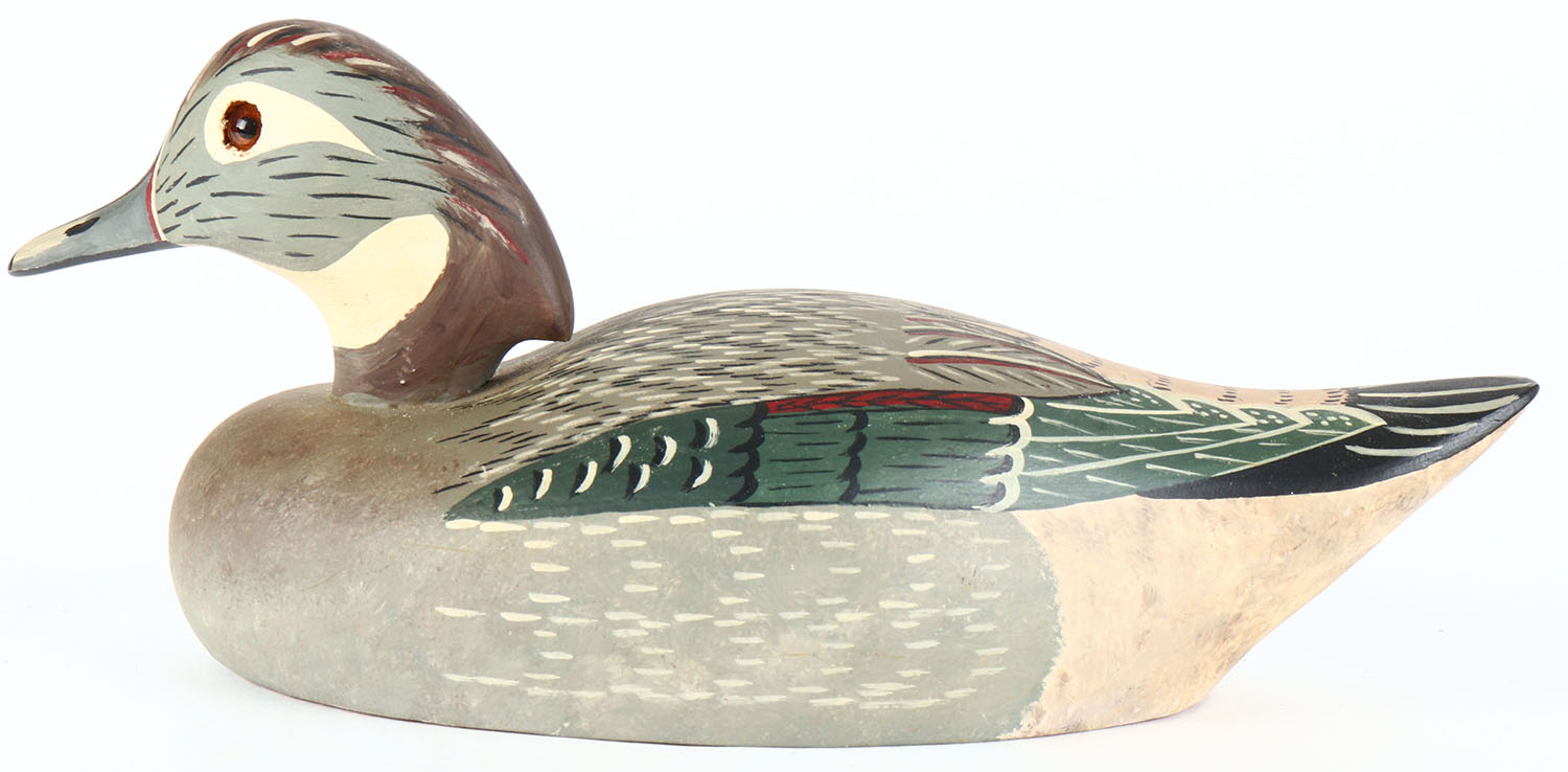 Woodduck Hen by Wildfowler Decoys, Point Pleasant NJ, glass eyes, solid wood, original paint, structurally excellent, branded by WILDFOWLER DECOYS on bottom. Grade: Excellent + - Value: 30 to 60