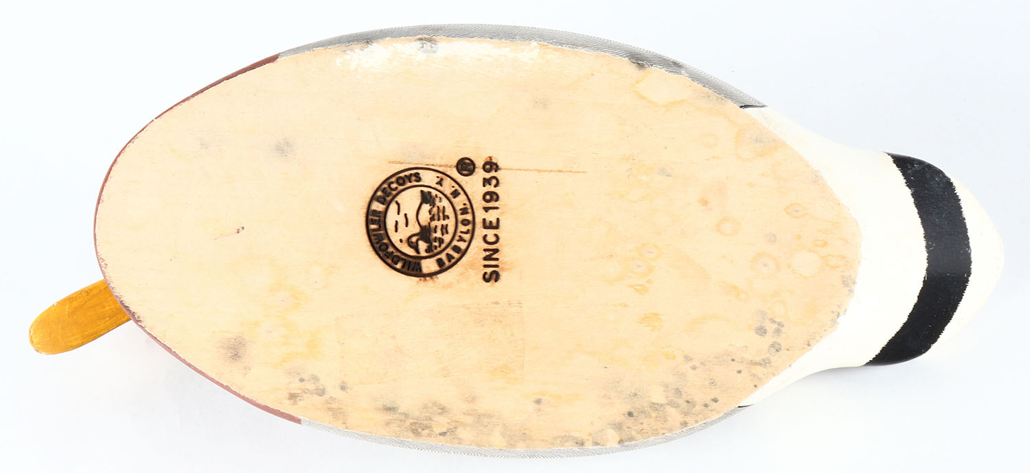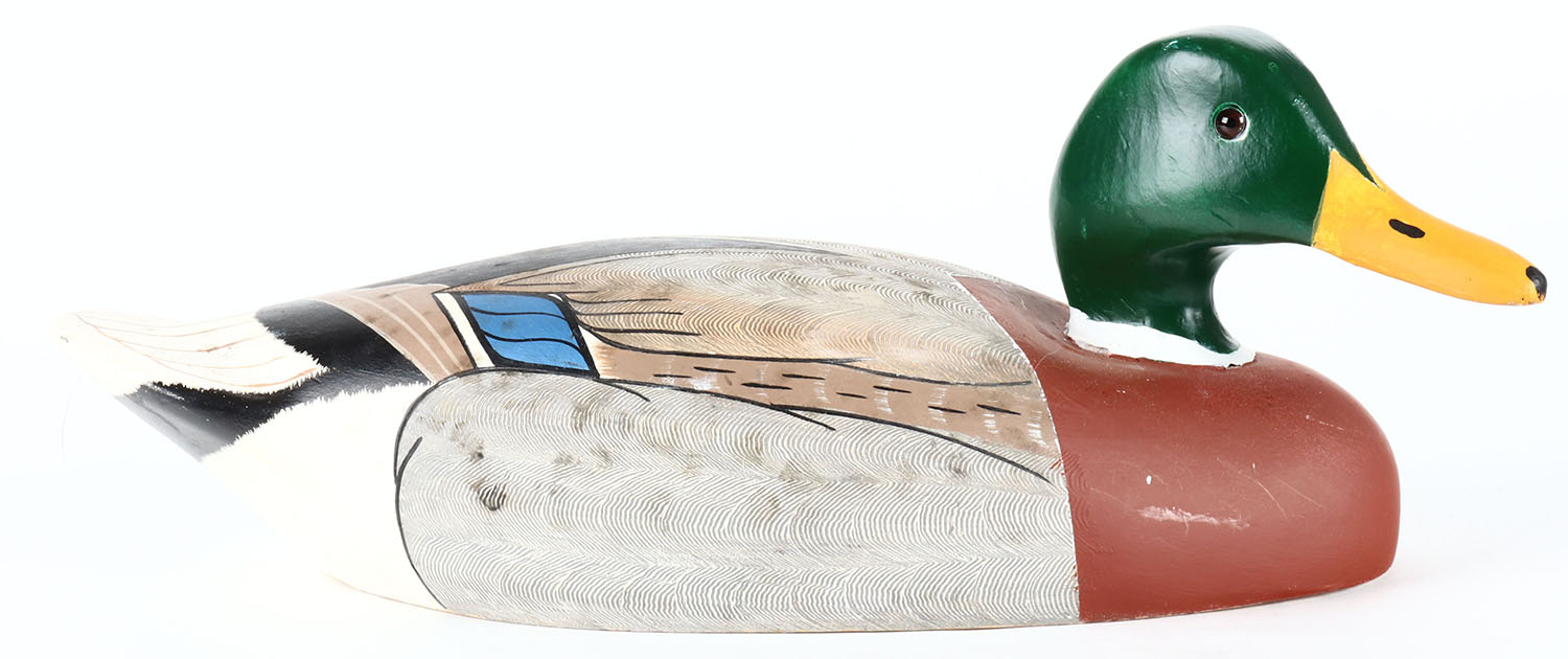 Mallard Drake by Wildfowler Decoys Babylon NY, glass eyes, solid wood, original paint with comb painting, structurally excellent, branded by WILDFOWLER DECOYS on bottom. Grade: Excellent ++ - Value: 30 to 60