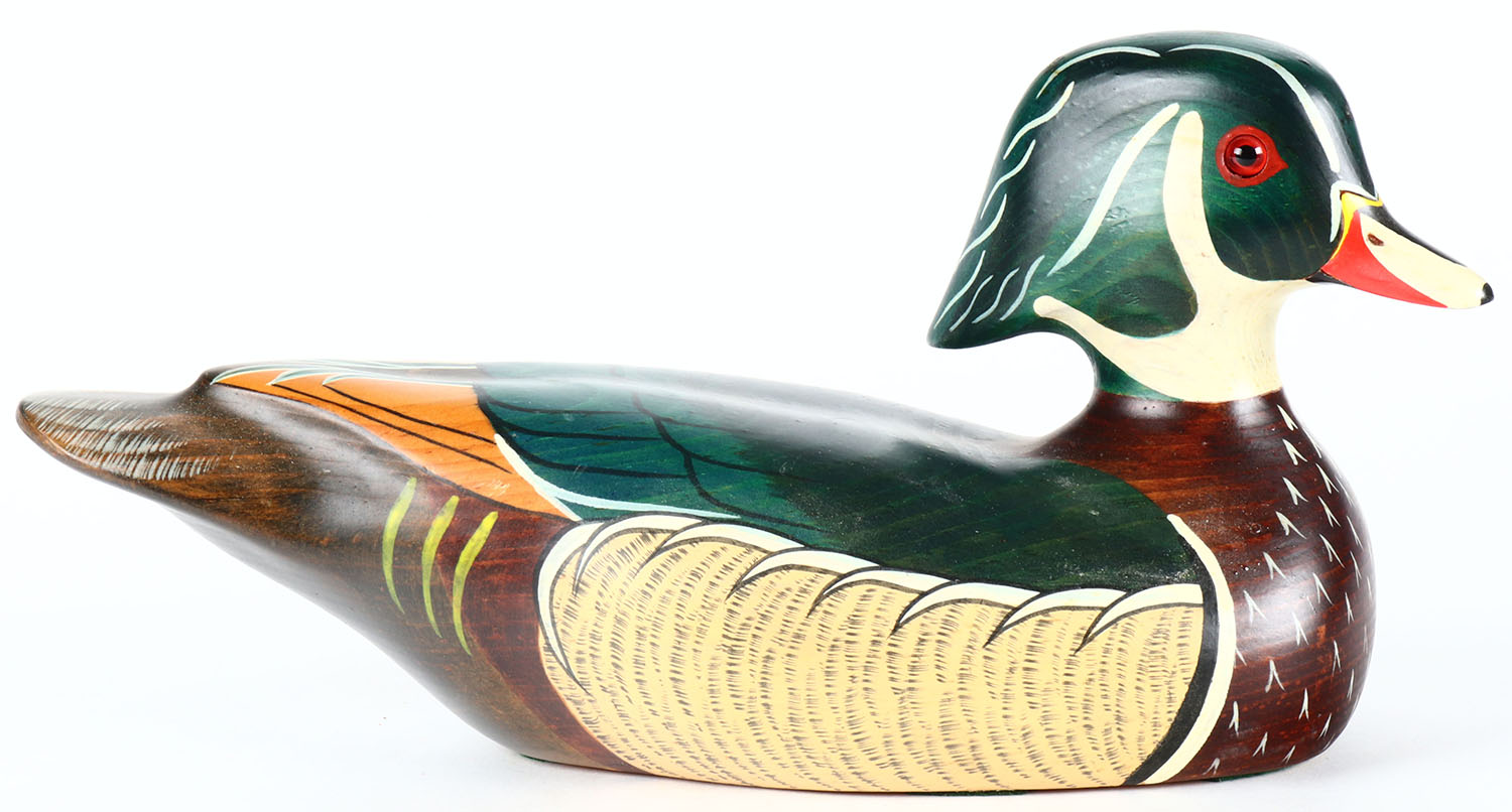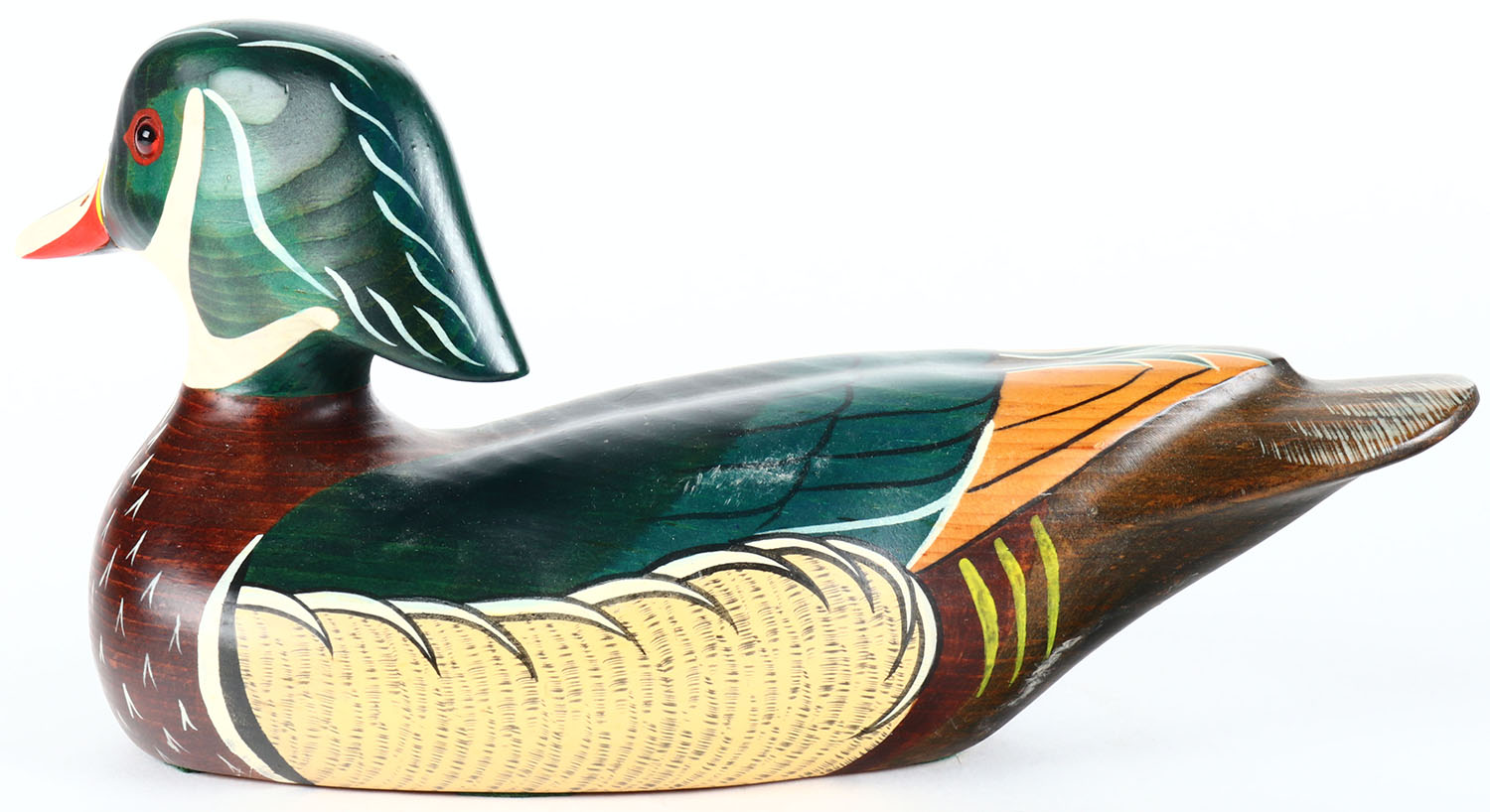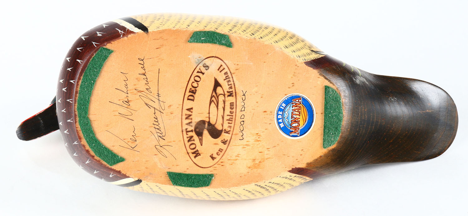 Woodduck Drake by Montana Decoys, Ken and Kathleen Marshall, glass eyes, solid wood, original paint, structurally excellent, branded by MONTANA DECOYS on bottom. Grade: Excellent + - Value: 40 to 80