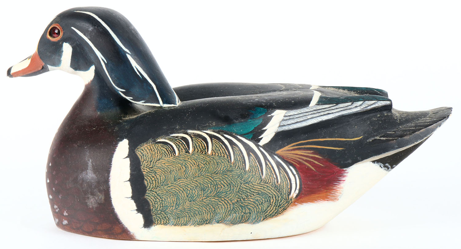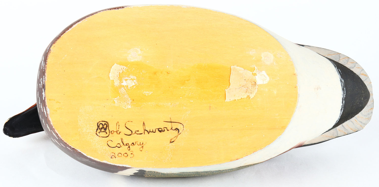 Woodduck Drake by Bob Schwartz, Calgary, Canada, Glass eyes, hollow wood, original paint, with combing, structurally excellent, signed on bottom by maker. Grade: Excellent - Value: 40 to 80