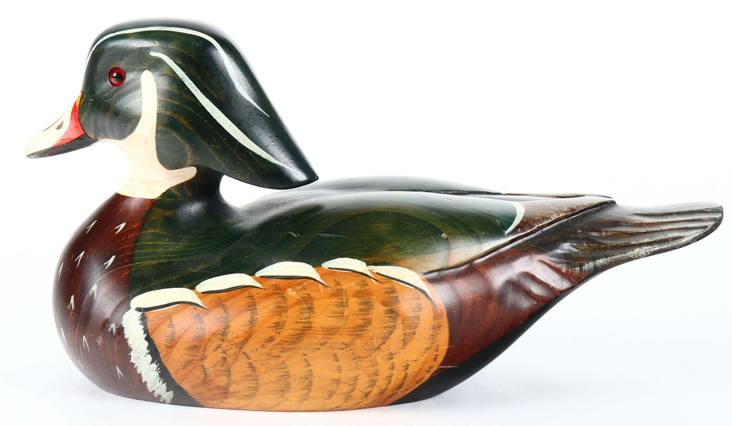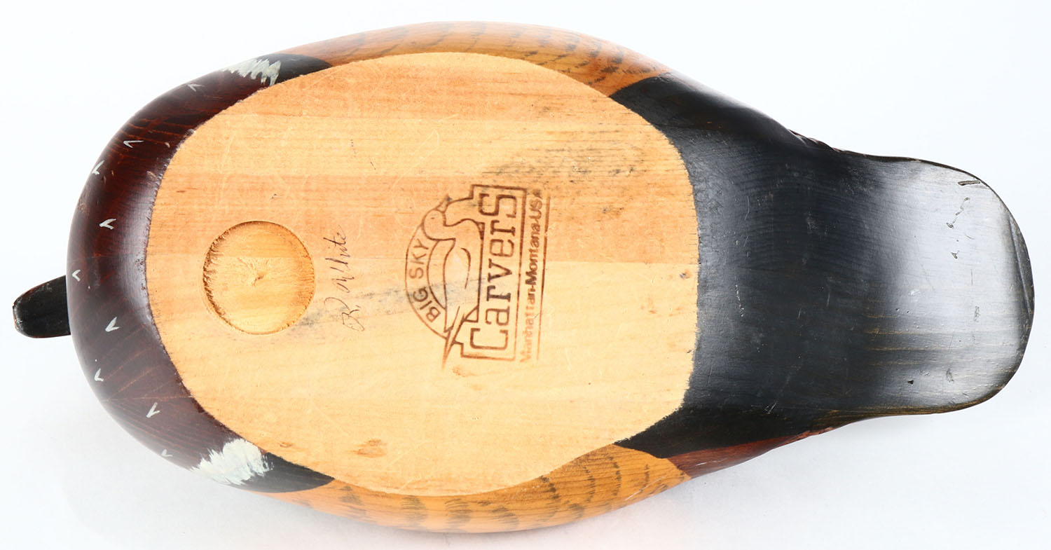 Woodduck Drake by Big Sky Carvers, Manhattan-Montana, glass eyes, solid wood, original paint, structurally excellent, branded by BIG SKY CARVERS on bottom. Grade: Excellent ++ - Value: 50 to 100
