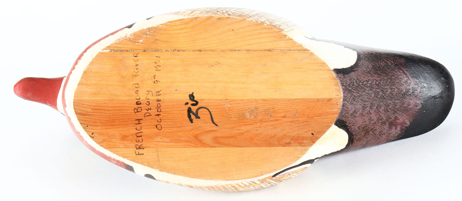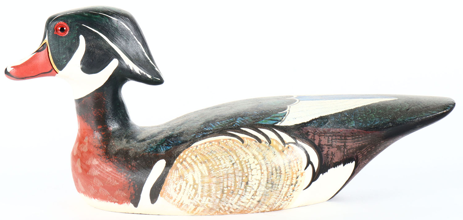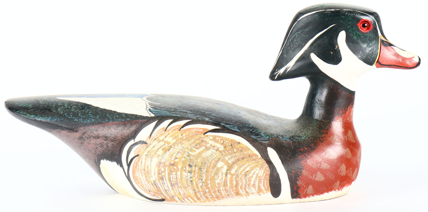 Woodduck Drake by French Broad River, glass eyes, solid wood, original paint, structurally excellent. Grade: Excellent - Value: 40 to 60