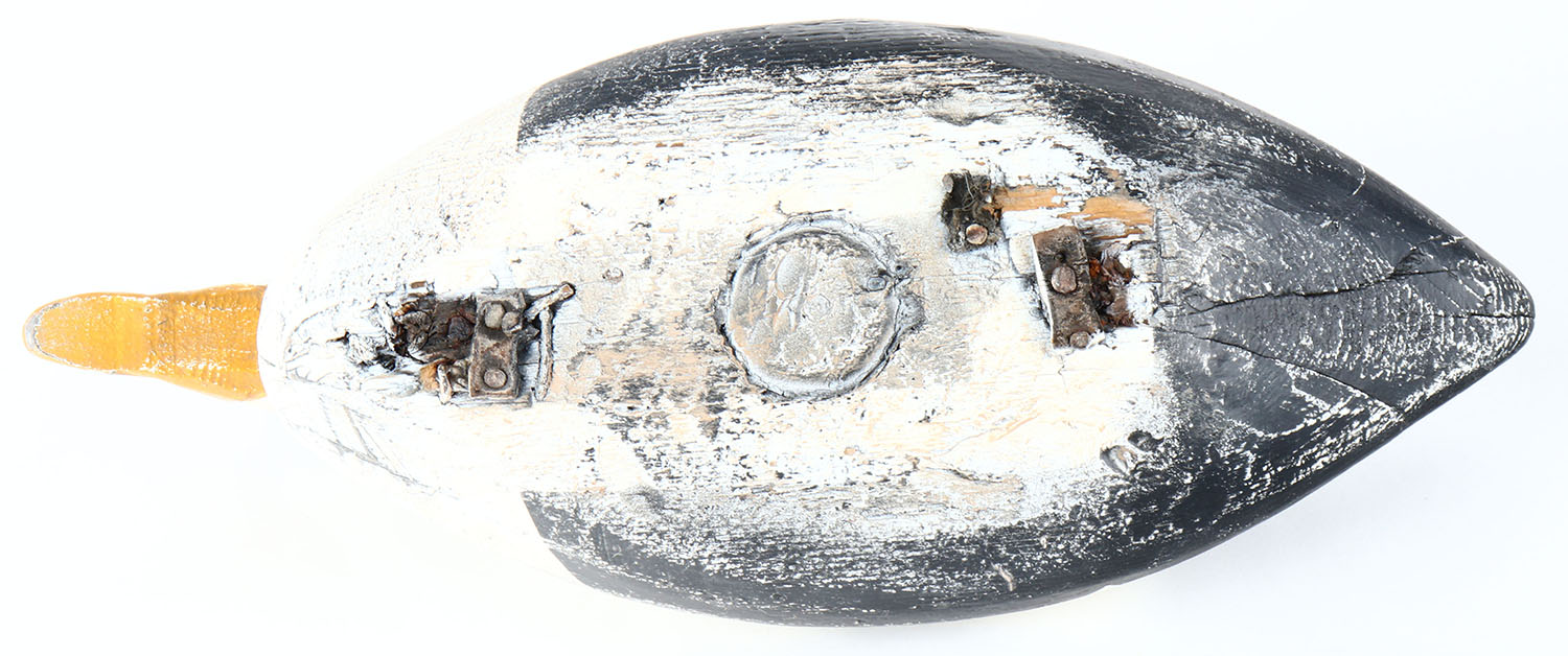 Eider by unknown maker with the initials J.G,, glass eyes, solid wood, repainted in style to appear vintage, has age cracks on back and bottom, ,maker initials on bottom. Grade: Very Good + - Value: 30 to 60