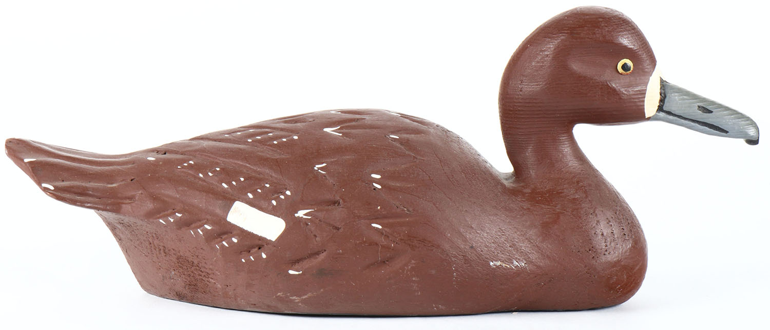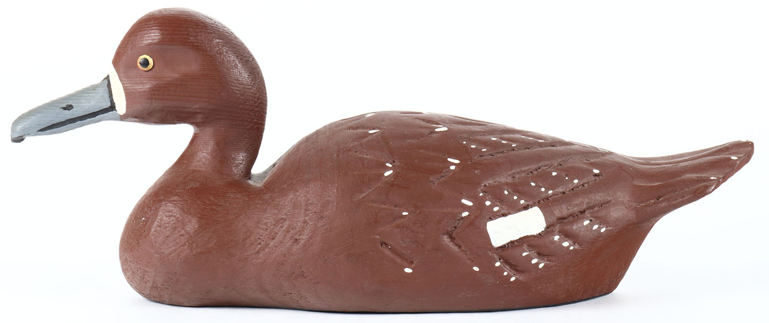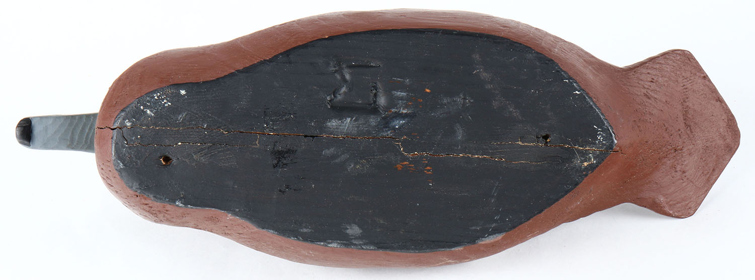 Bluebill hen by unknown Quebec maker, tack eyes, solid wood, original paint, has age cracks on bottom. Grade: Very Good + - Value: 20 to 40