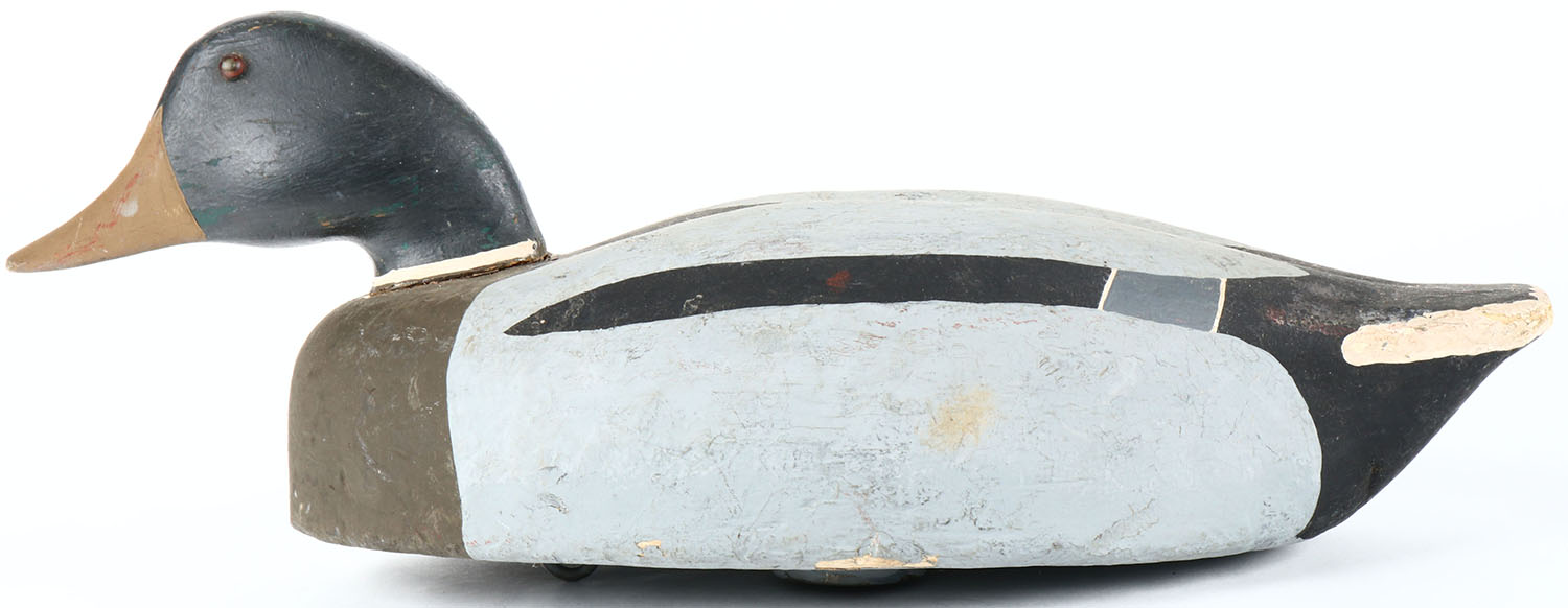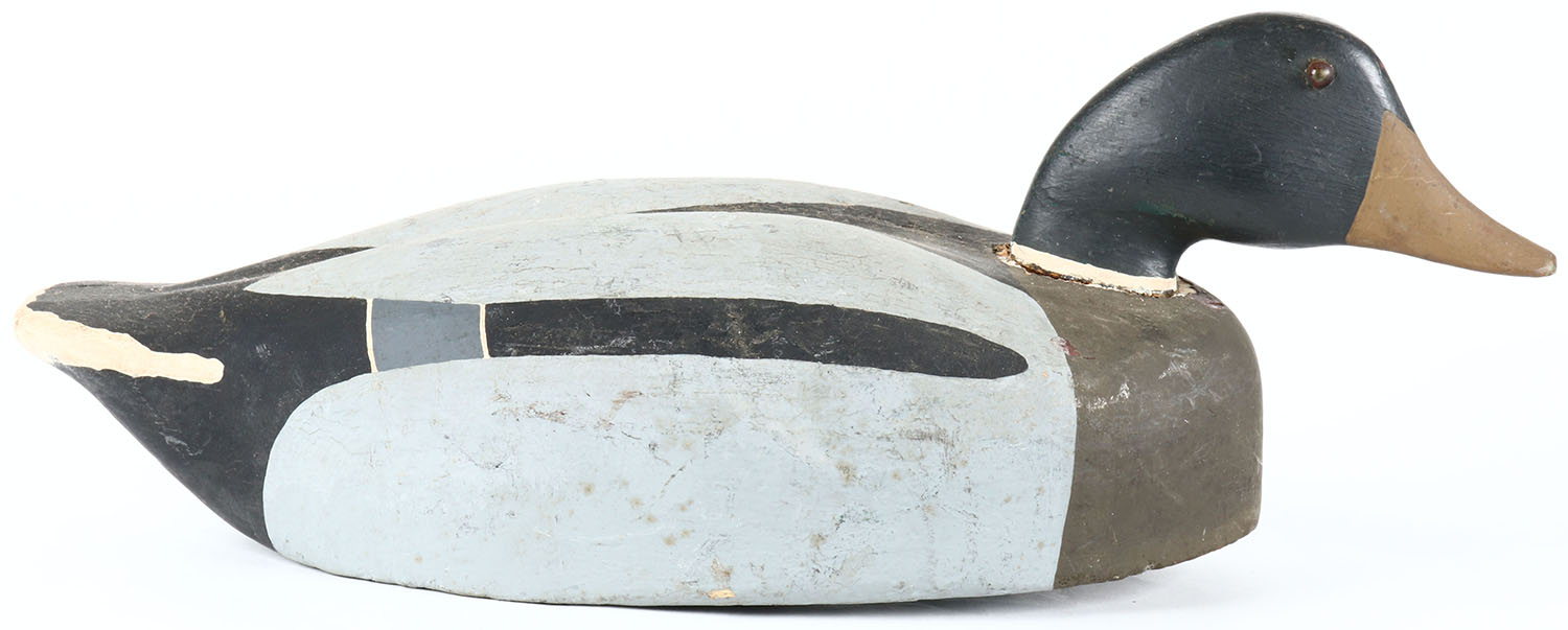 Mallard Drake by unknown maker, tack eyes, solid balsa wood, repaint, head is loose. Grade: Very Good + - Value: 20 to 40