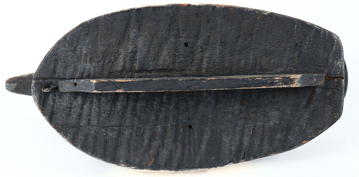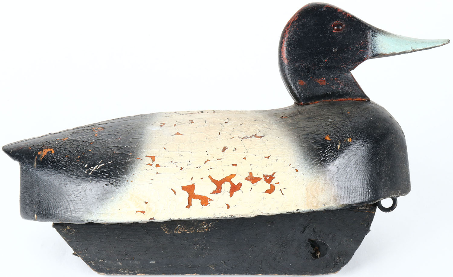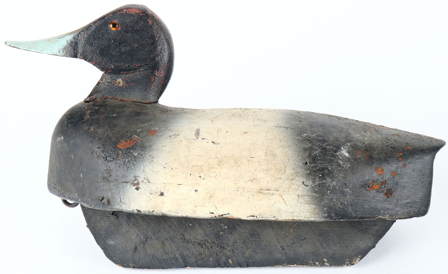 Bluebill Drake by unknown maker, glass eyes, solid wood, original paint, has age cracks on back. Grade: Very Good + - Value: 20 to 40