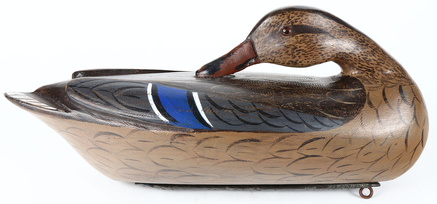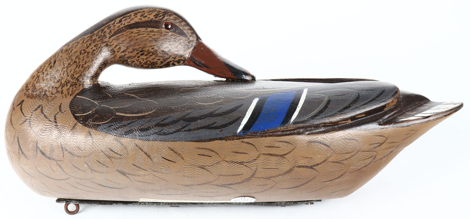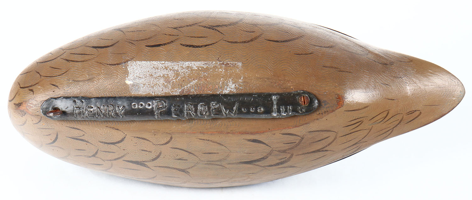 Preening Mallard Hen by Charles Moore, IL in the style of Charlie Perdew, glass eyes, hollow wood, original paint, remnants of tape on bottom, structurally excellent, branded by HENRY PERDEW on bottom lead. Grade: Excellent - Value: 70 to 150