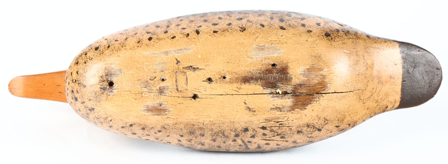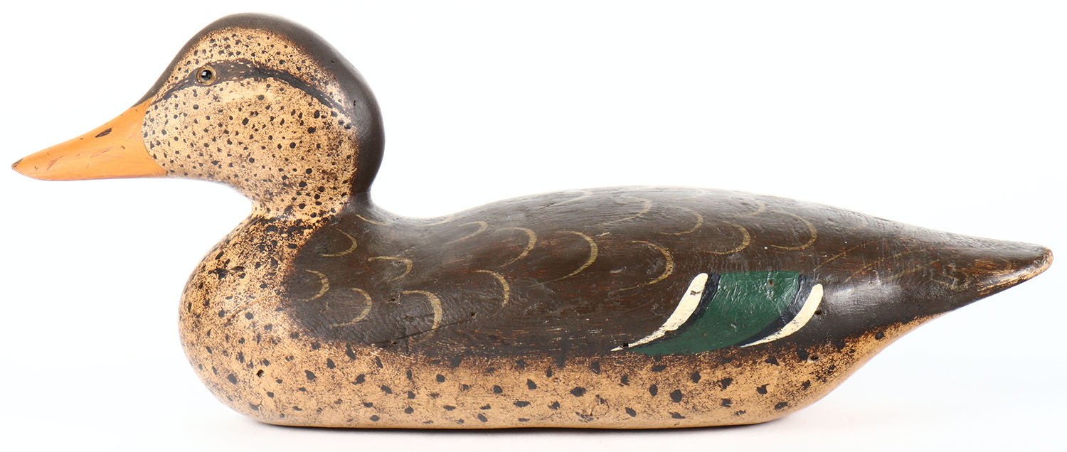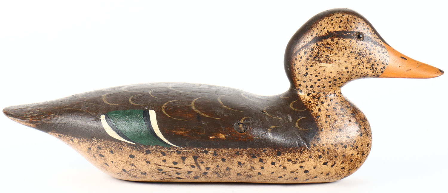 Standard Mallard Hen by Mason Decoy Company, Detroit, MI, 1896-1924, glass eyes, solid wood, complete repaint, has age cracks on bottom. Grade: Very Good - Value: 40 to 80