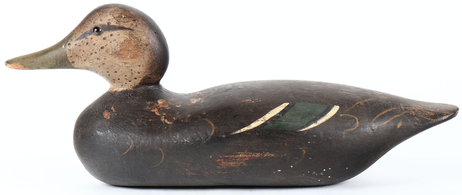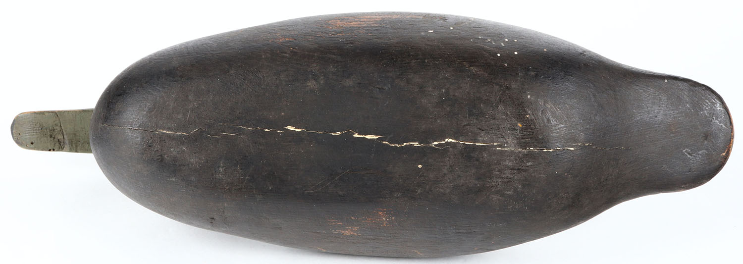 Standard Black Duckk by Mason Decoy Company, Detroit, MI, 1896-1924, glass eyes, solid wood, compete repaint, has age crack on bottom. Grade: Very Good - Value: 40 to 80