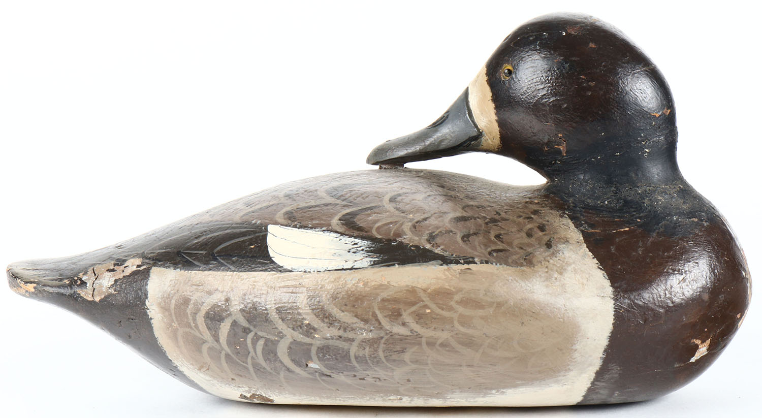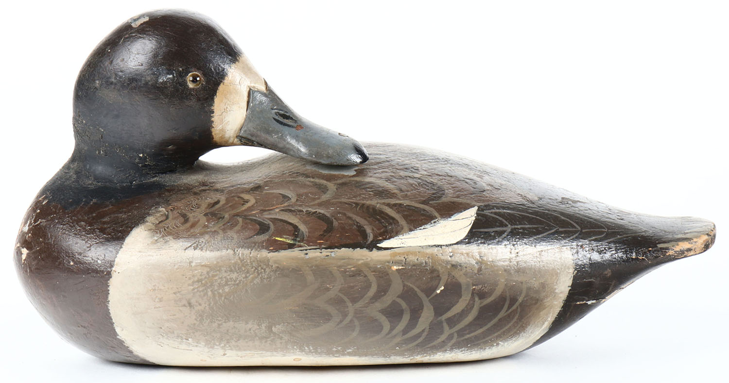 Preening Bluebill Hen by unknown maker, glass eyes, solid wood, original paint with overpaint on old neck repair, has age cracks on bottom and back. Grade: Very Good + - Value: 20 to 40