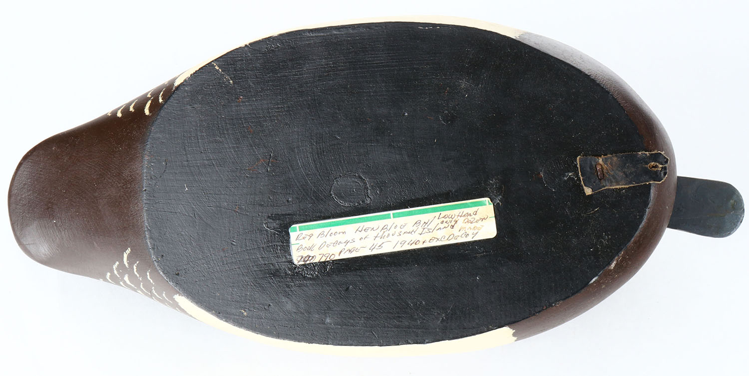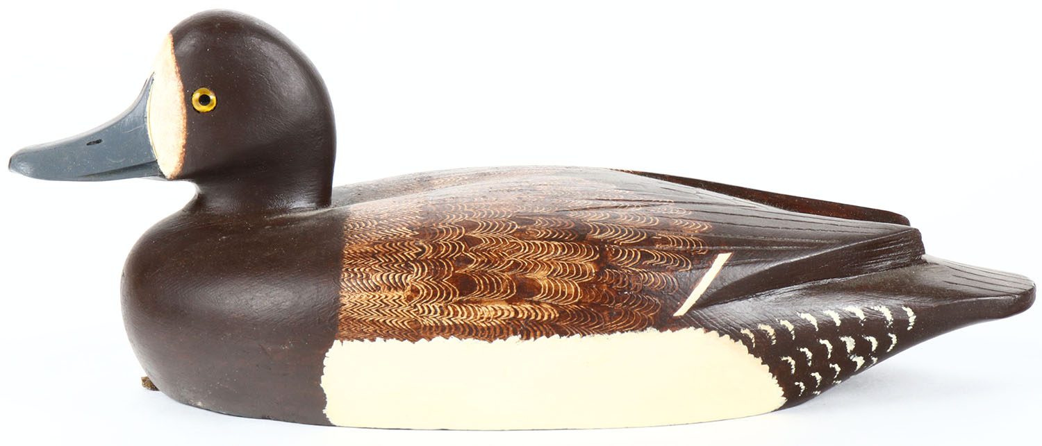 Bluebill Hen by Reg Bloom, Kingston, Ontario, glass eyes, solid wood, original paint with comb painting, structurally excellent. Grade: MINT - Value: 70 to 150