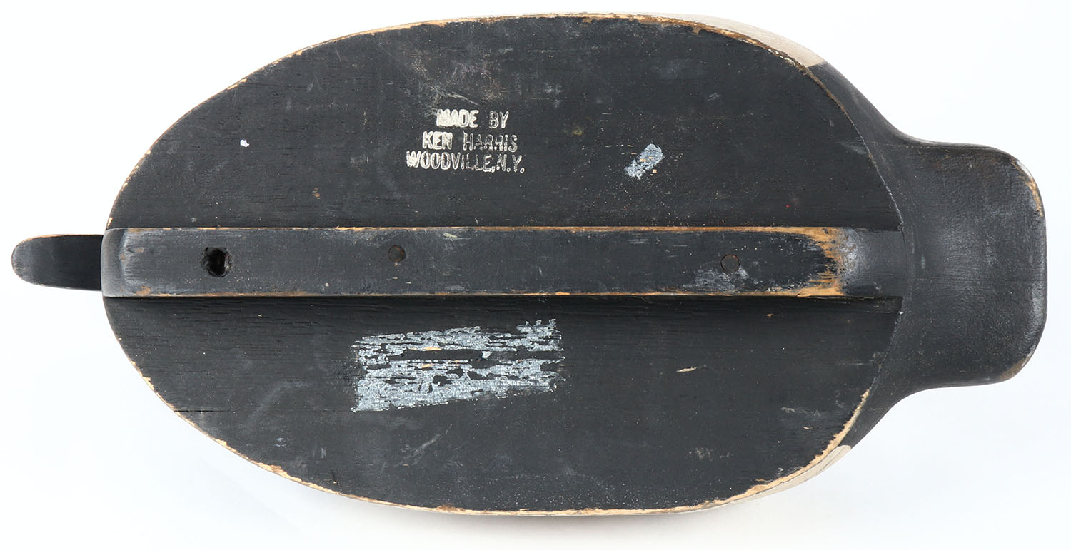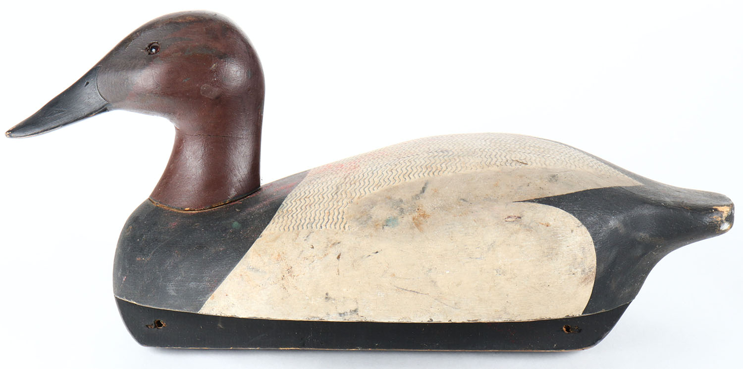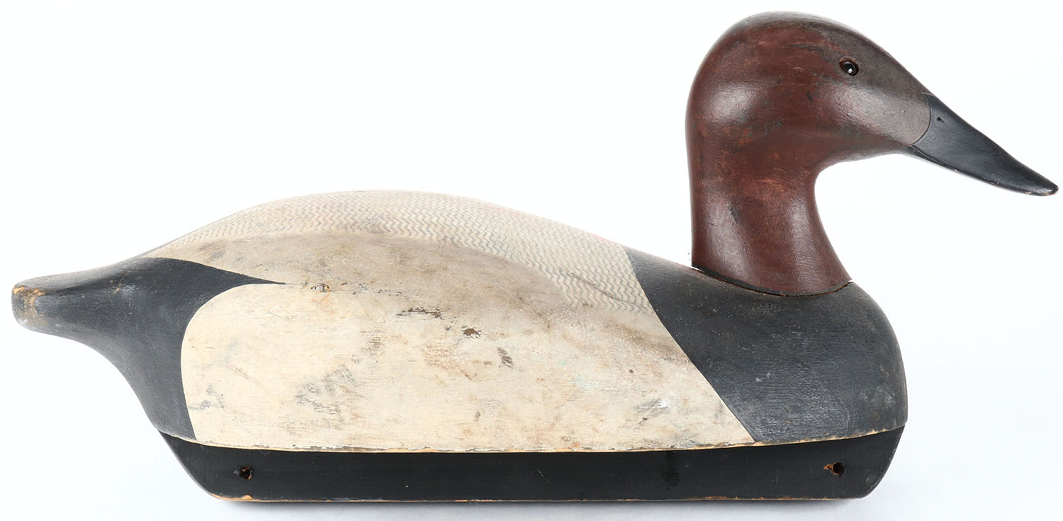 Canvasback Drake by Ken Harris, Woodville, N.Y. glass eyes, solid wood, original paint, structurally excellent, branded by KEN HARRIS on bottom. Grade: Excellent - Value: 100 to 300