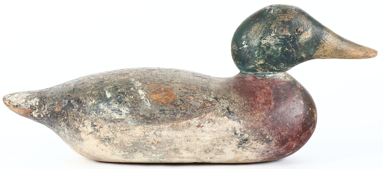 Standard Mallard Drake by Mason Decoy Company, Detroit, MI, 1896-1924, glass eyes, solid wood, combination of original paint and overpaint, has age cracks on back and bottom. Grade: Very Good + - Value: 30 to 60