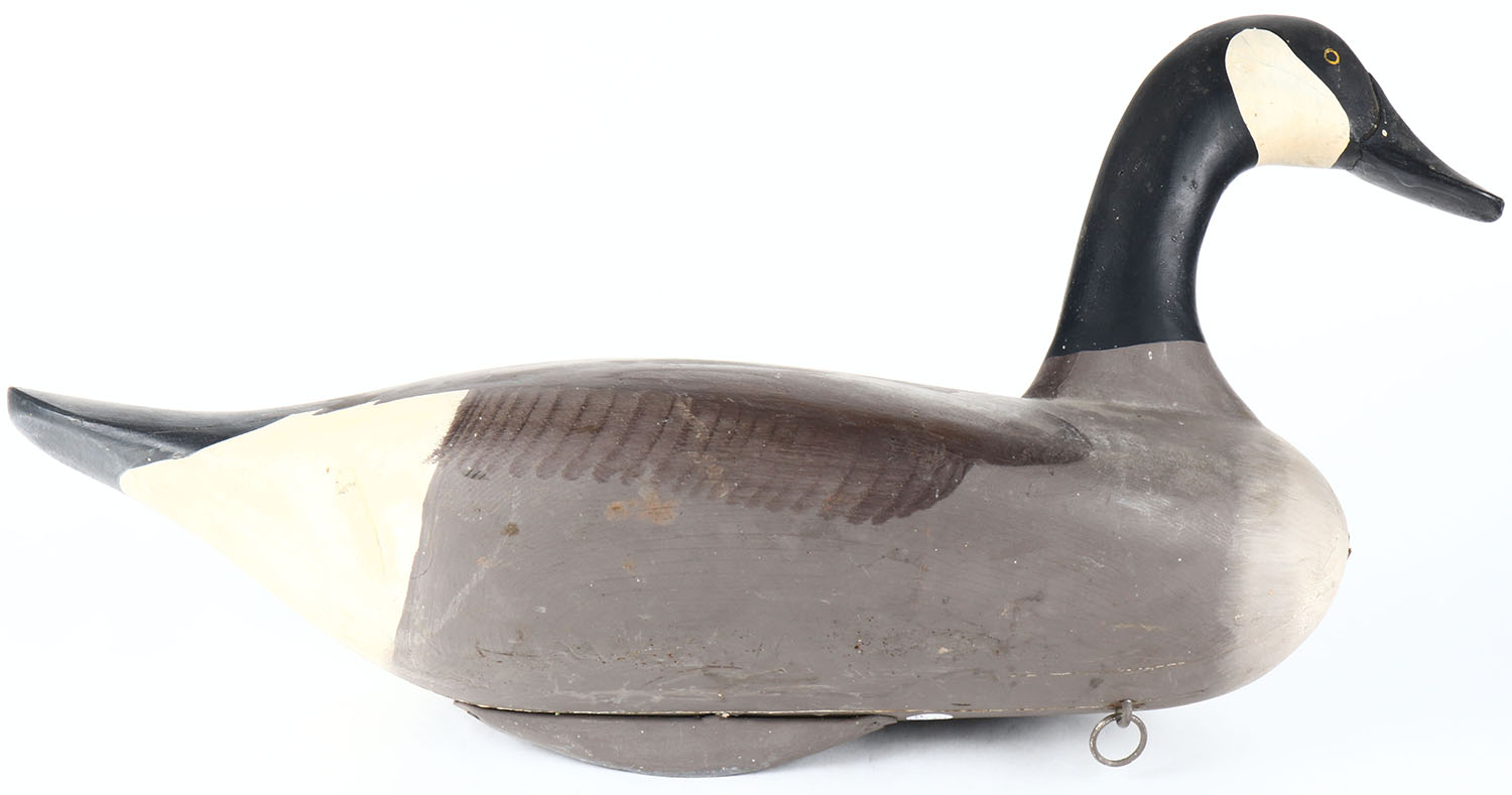 Canada Goose by R. Madison Mitchell, Havre de Grace, MD, solid wood, painted eyes, original paint, has age cracks on bottom and back, signed on bottom. Grade: Very Good ++ - Value: 100 to 300