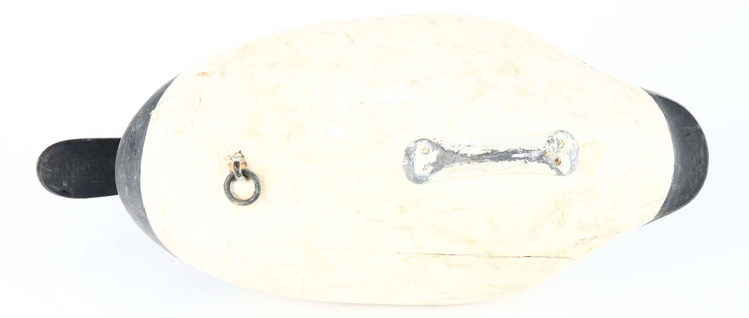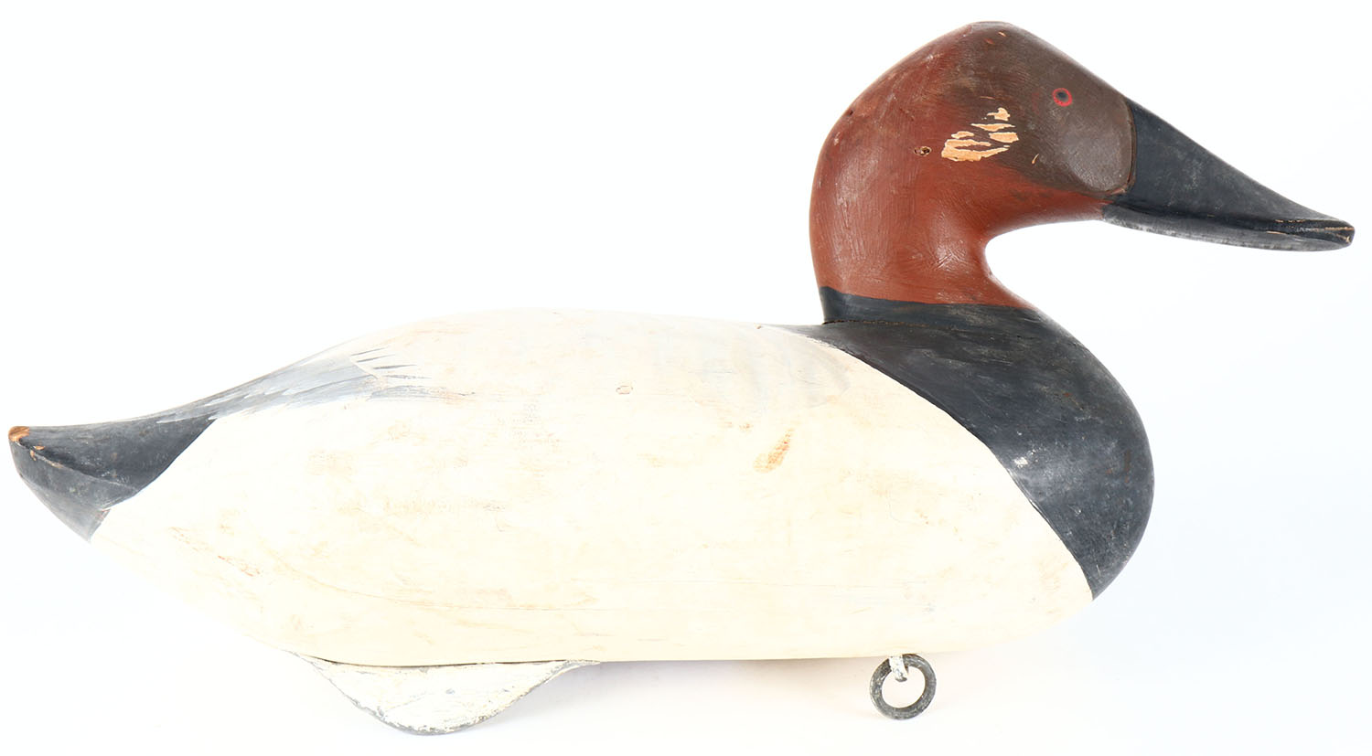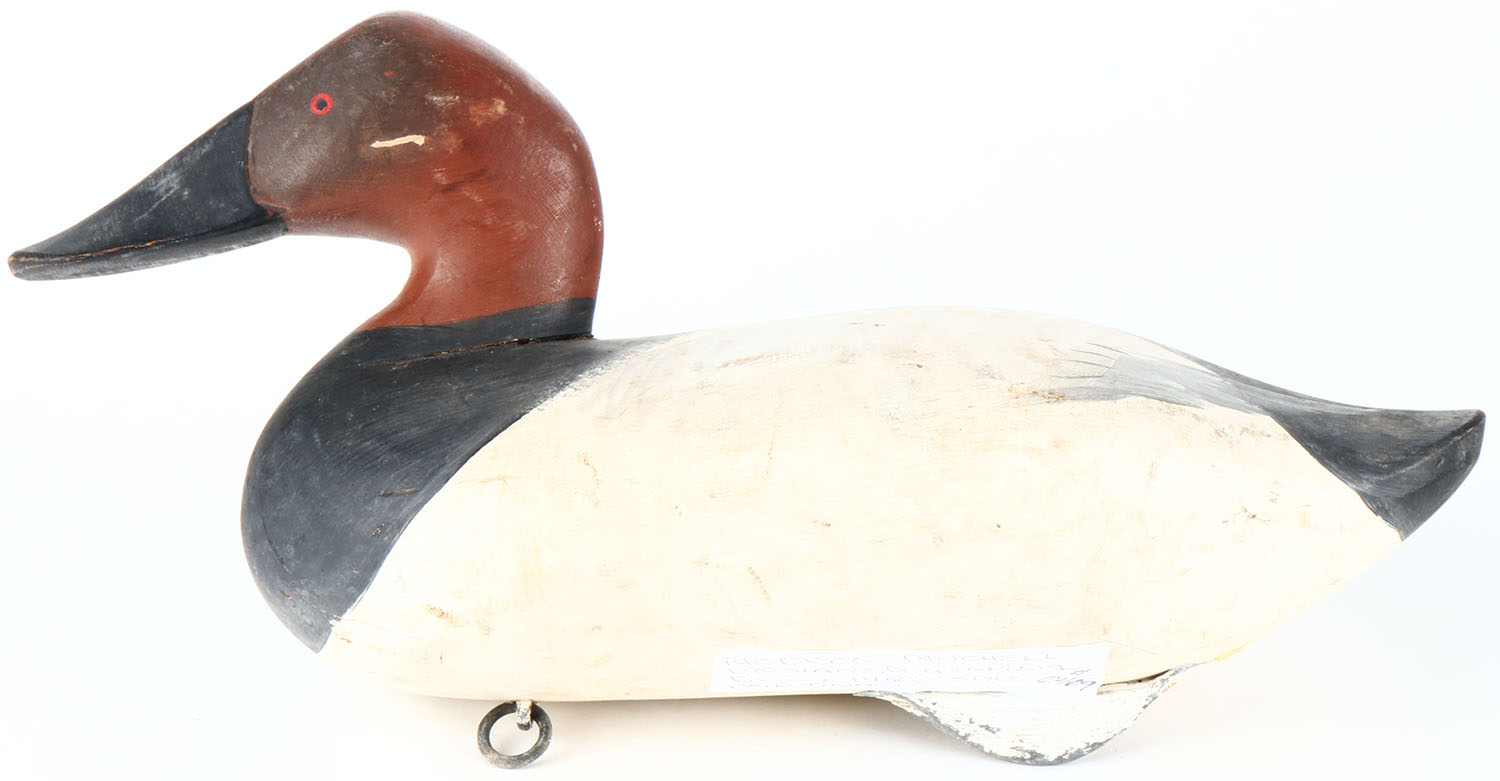 Canvasback Drake by R. Madison Mitchell, Havre de Grace, MD, painted eyes, solid wood, original paint, hunting wear to sides of head, age cracks on bottom. Grade: Very Good + - Value: 100 to 200