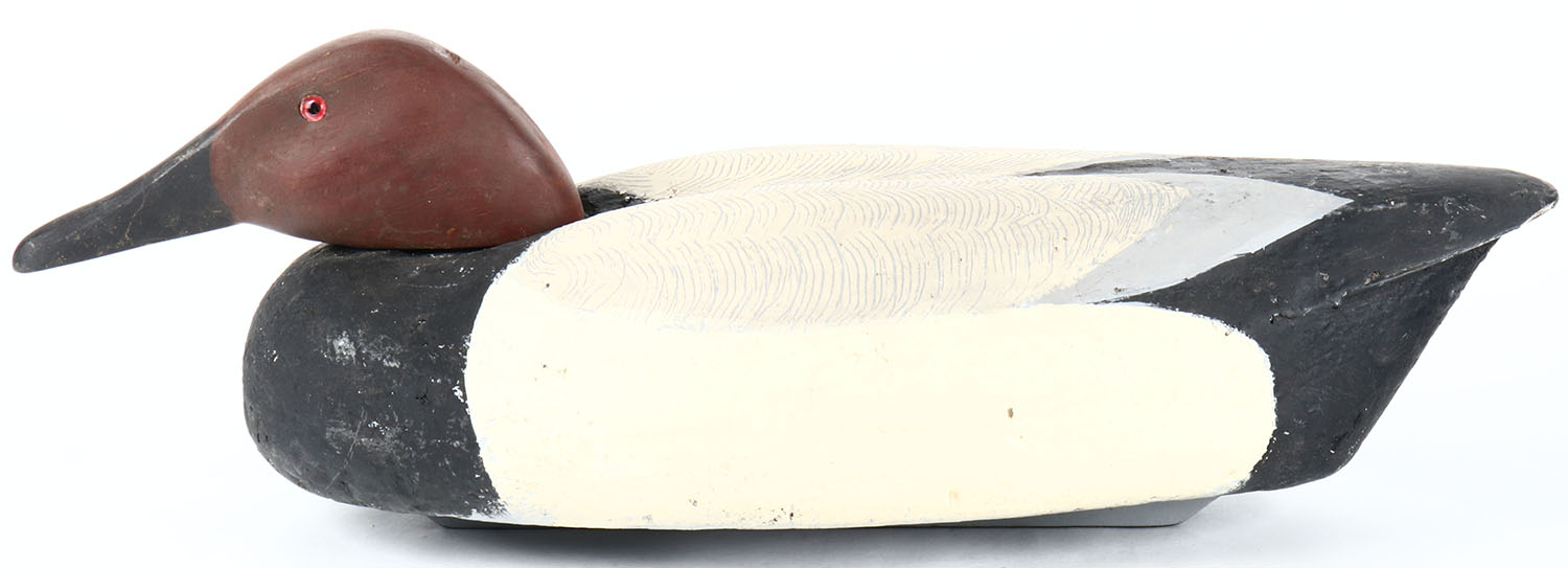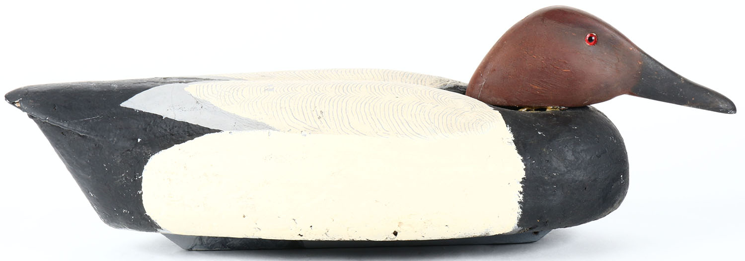 Canvasback Drake by unknown maker, glass eyes, solid cork body, original paint with comb painting, Grade: Excellent - Value: 20 to 40
