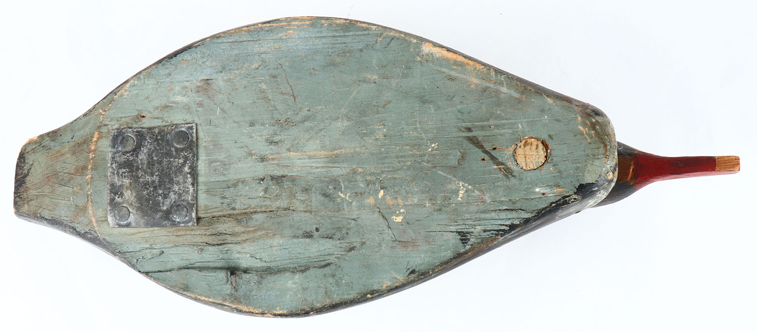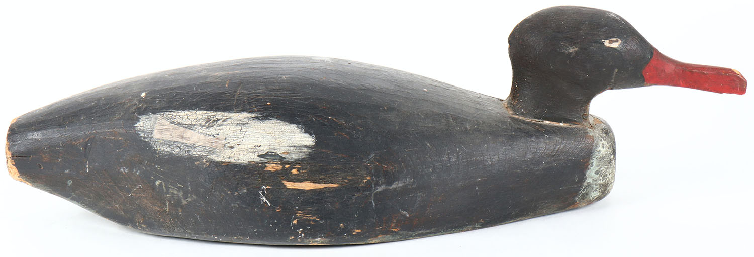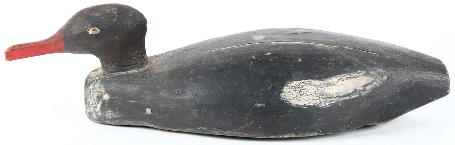 Hooded Merganser by unknown maker, painted eyes, solid wood, likely original paint, has age crack on back. Grade: Very Good + - Value: 30 to 60