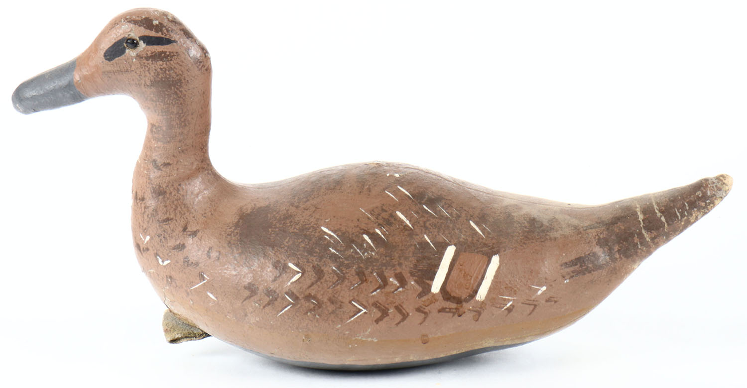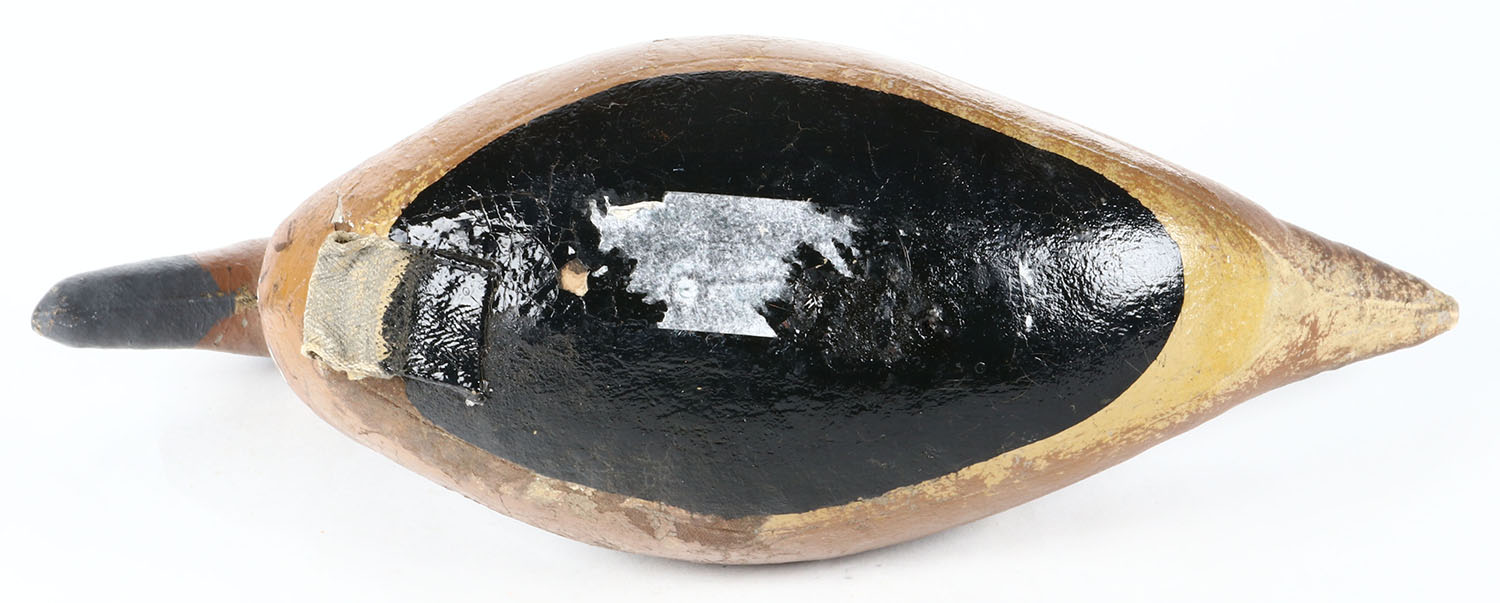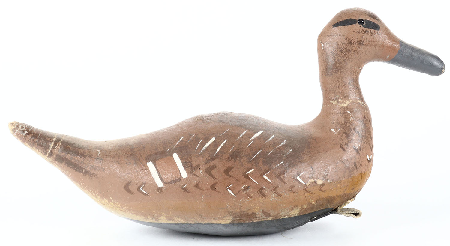 Pintail Hen by Scotts Decoy Co., glass eyes, canvas over cork, original paint, structurally excellent, stamped xxx on bottom. Grade: Excellent + - Value: 50 to 100