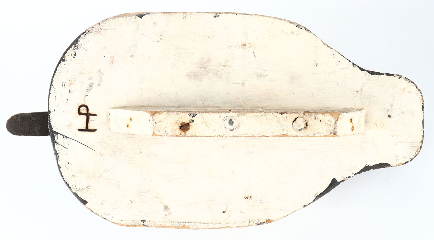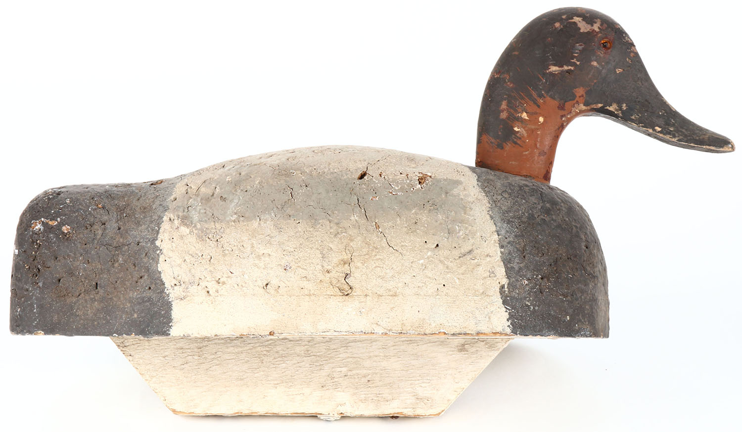 Canvasback Drake by unknown maker, glass eyes, hollow wood, combination of original paint and old hunter strengthening, has age cracks on entire body. Grade: Very Good - Value: 10 to 20