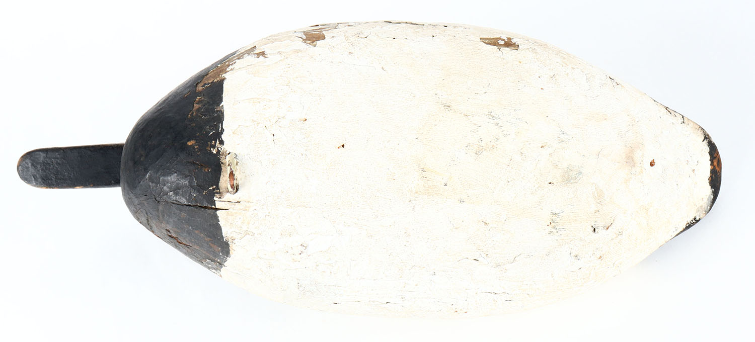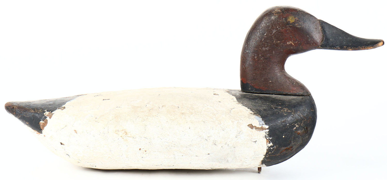 Canvasback Drake by unknown Maryland maker, painted eyes, solid wood, old hunter working repaint, has age cracks on back and bottom. Grade: Very Good - Value: 50 to 100