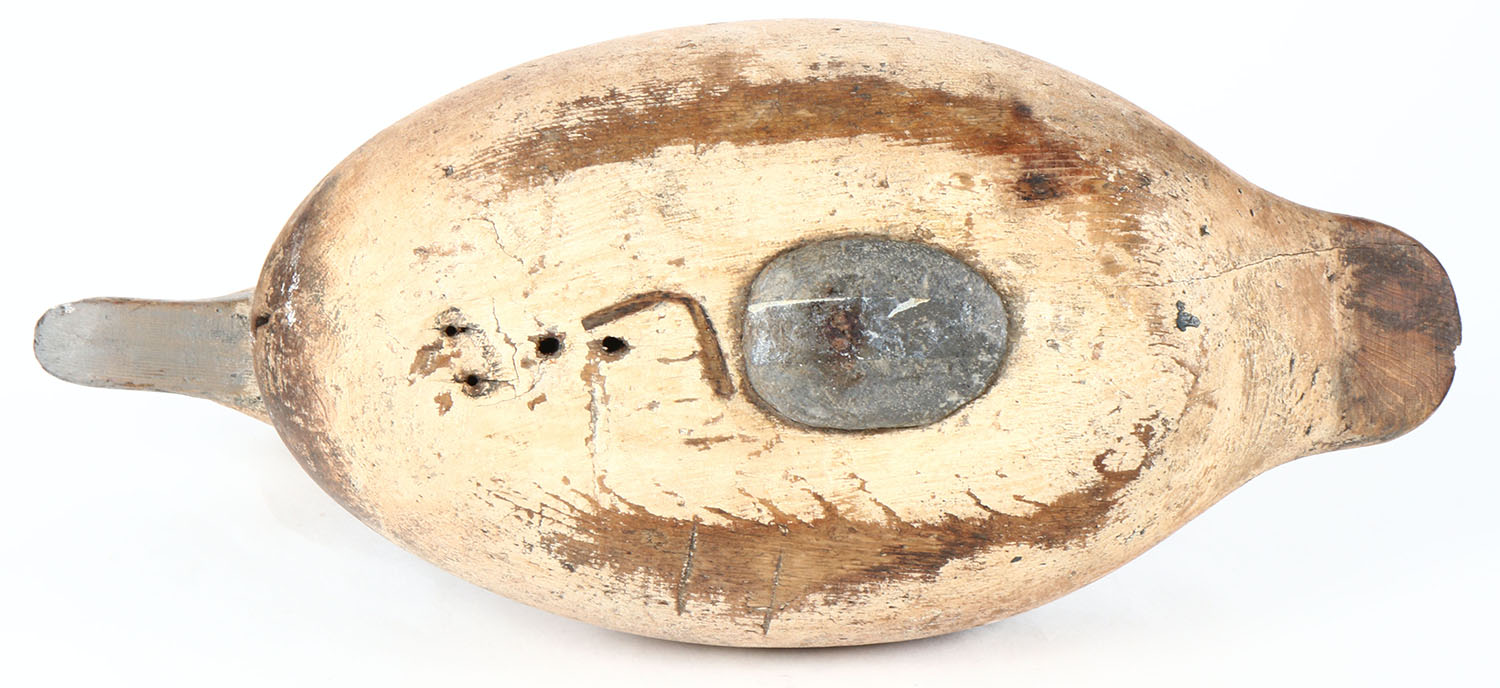 Challenge Bluebill Hen by Mason Decoy Company, Detroit, MI, 1896-1924. Glass eyes, solid wood, combination of old hunter strengthening with some original paint showing, has age cracks on bottom, tail is chipped. Grade: Very Good + - Value: 80 to 150