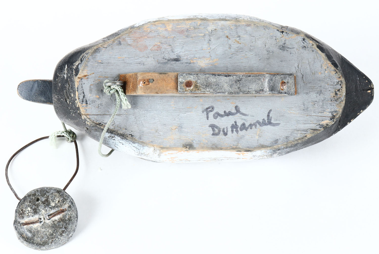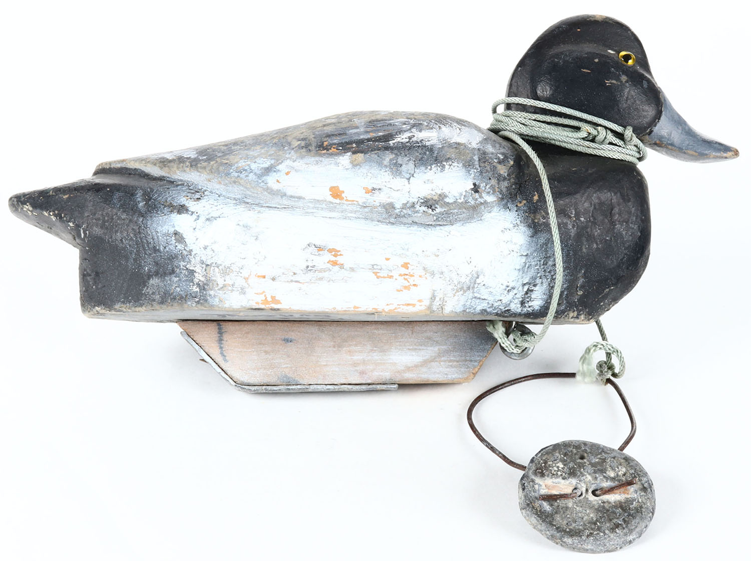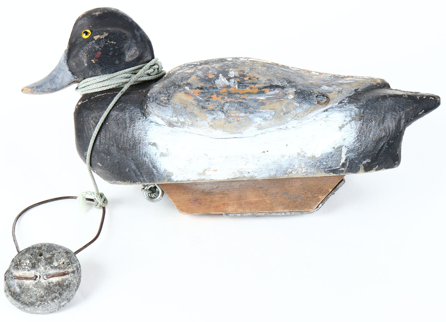 Bluebill Drake by unknown maker, glass eyes, solid wood, combination of original paint and old hunter strengthening, has age crack on back. Grade: Very Good - Value: 20 to 40
