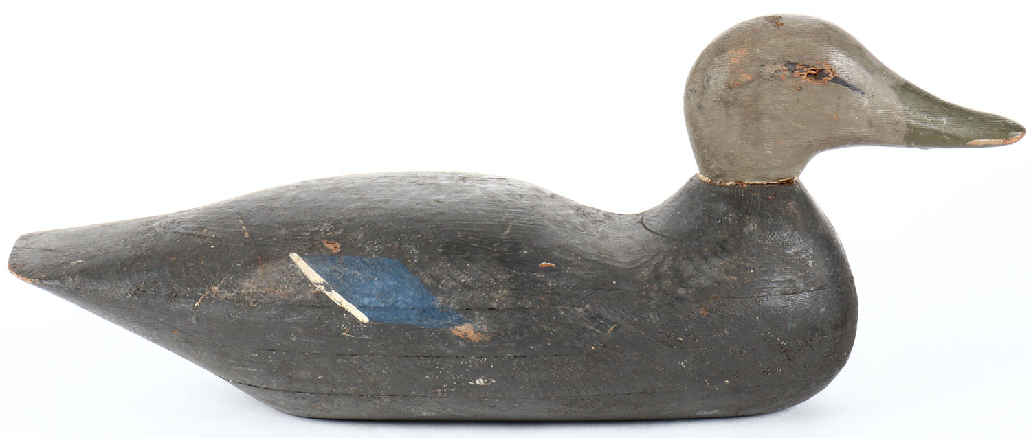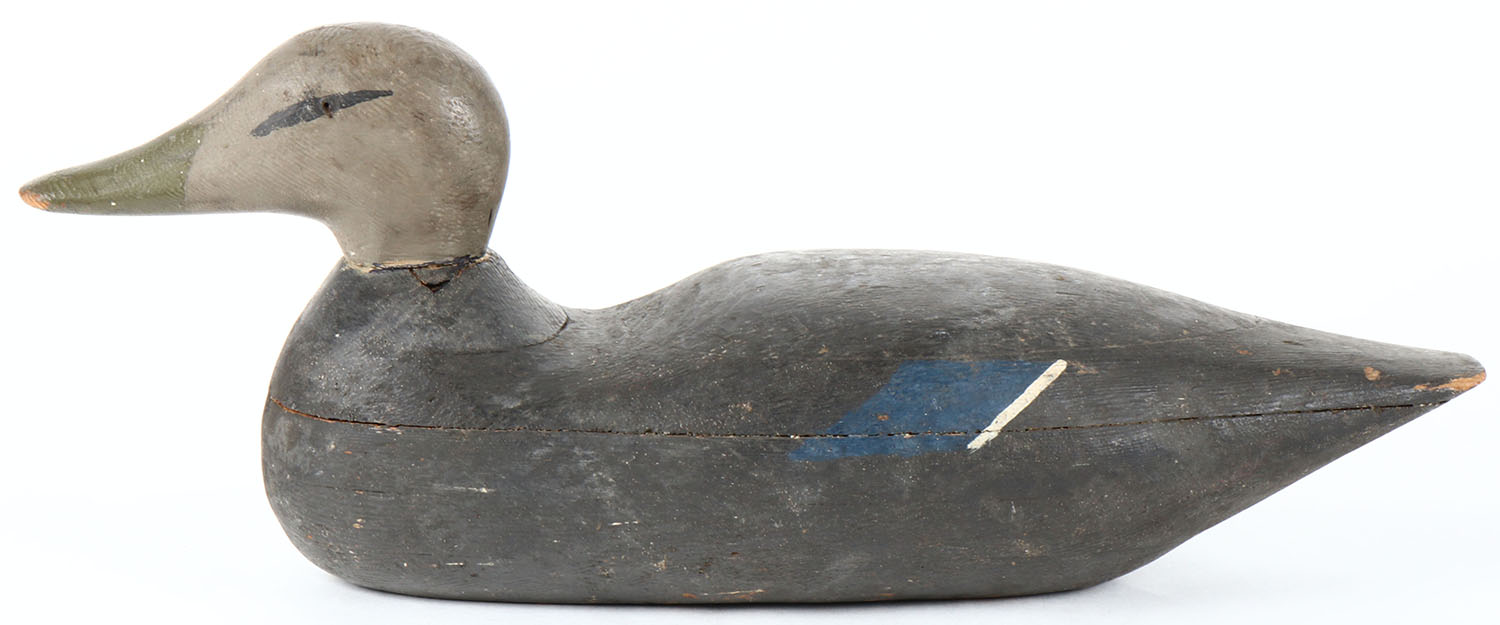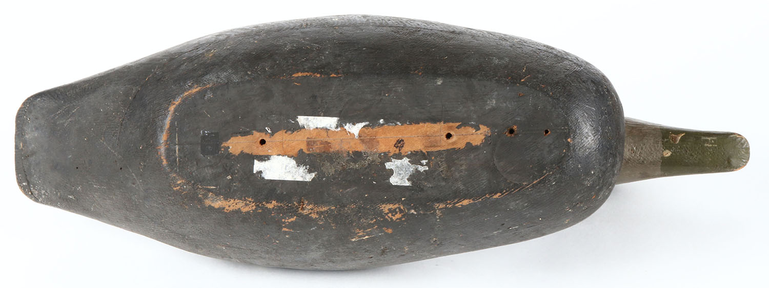 Black Duck by unknown maker, eyes are missing, hollow wood, original paint. Grade: Very Good ++ - Value: 20 to 40