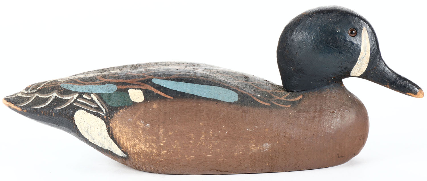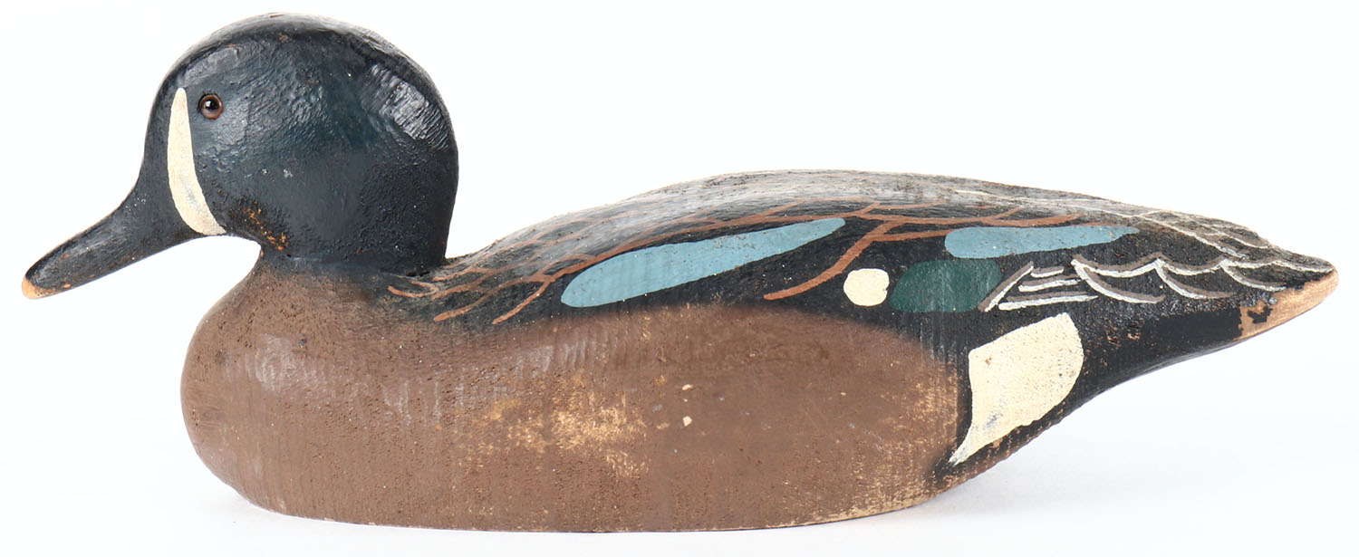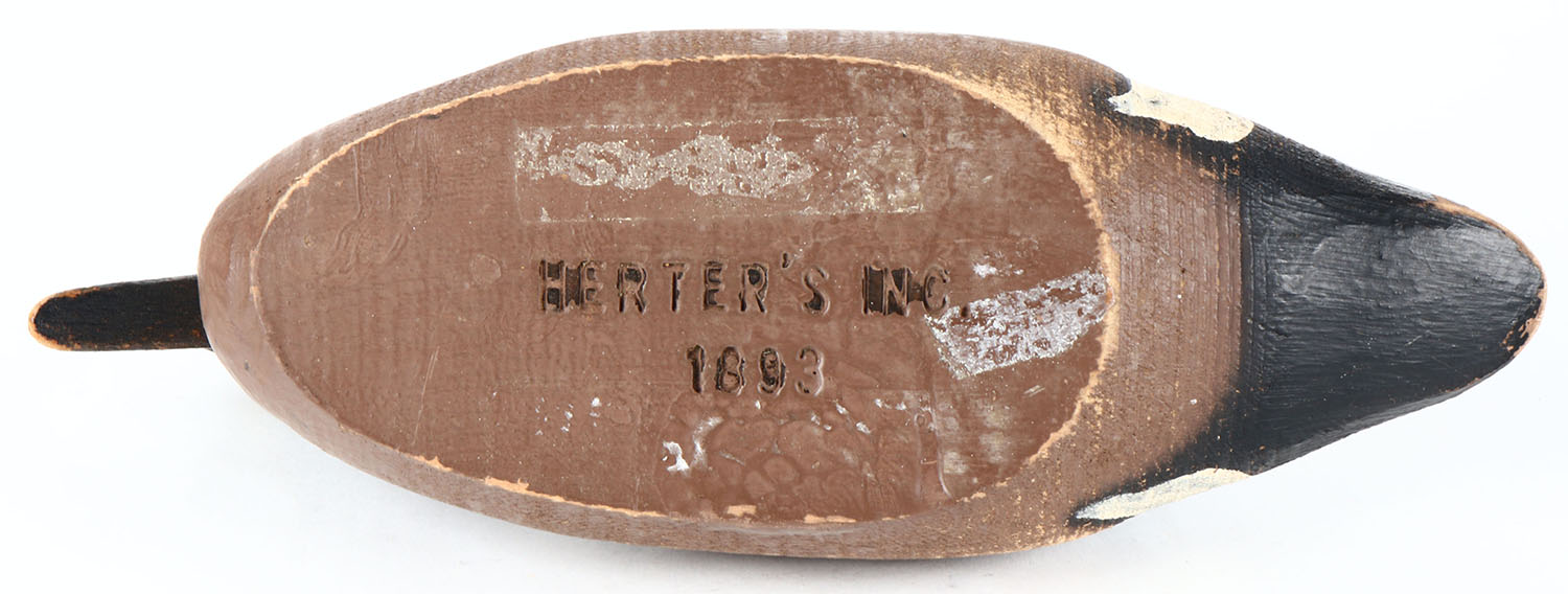 Blue Wing Teal Drake by Herters, Minnesota, 1893 series from the 1960s, glass eyes, solid wood, original paint with some wear, structurally excellent, branded HERTERS INC on bottom. Grade: Excellent - Value: 30 to 60