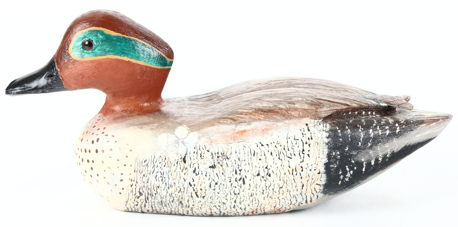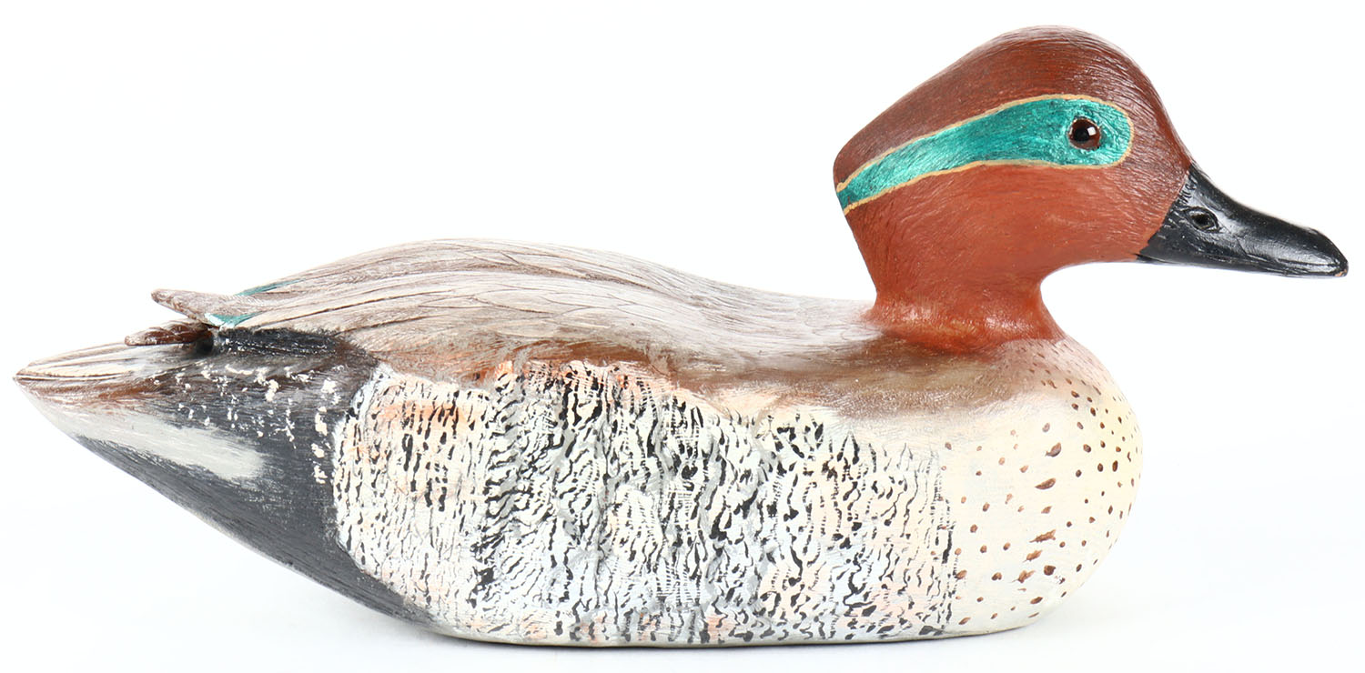 Green Wing Teal Drake by unknown maker, glass eyes, solid wood, original paint, structurally excellent. Grade: MINT - Value: 40 to 80