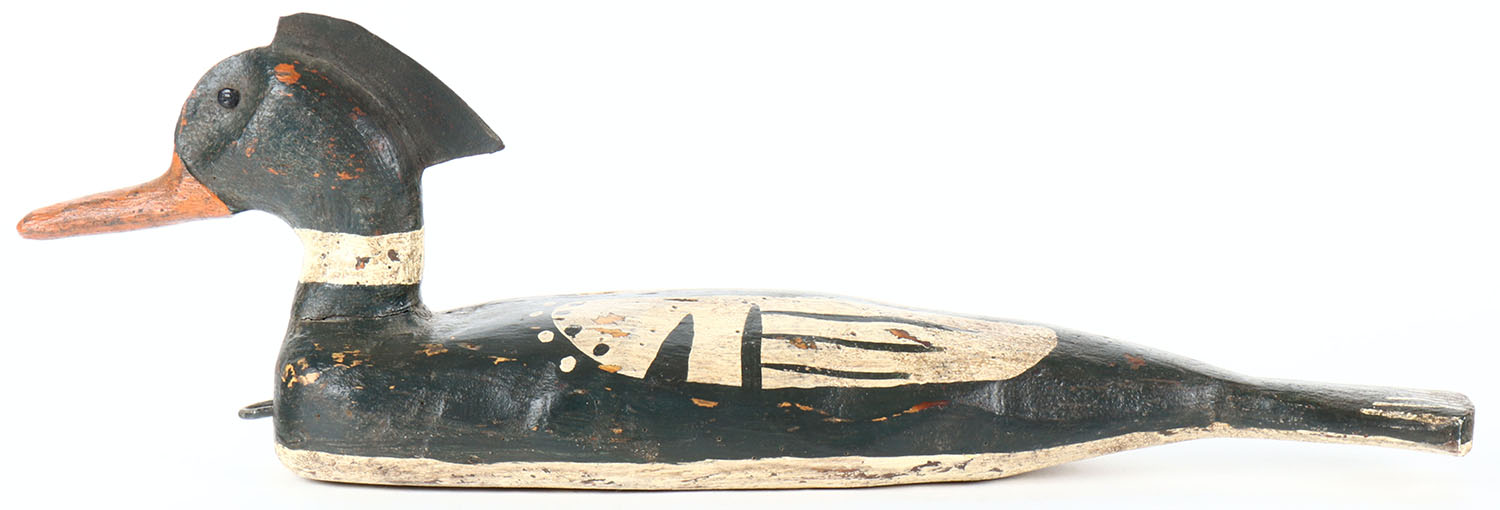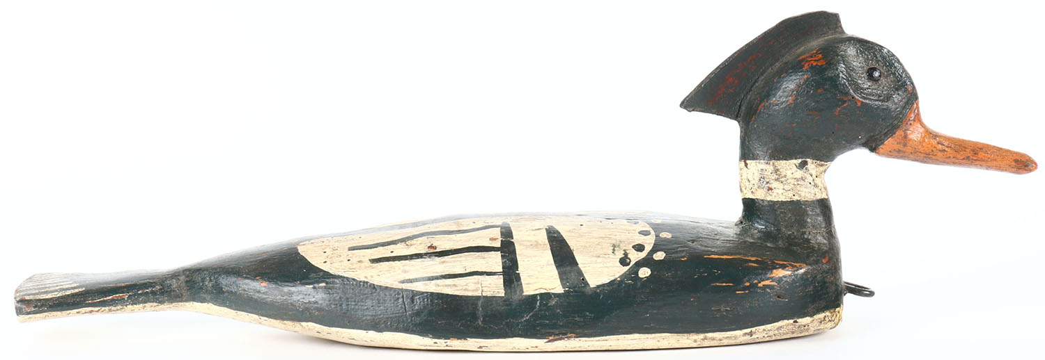Merganser by Bob Hardcastle, tack eyes, solid wood, original paint distressed to appear old, structurally excellent, signed on bottom. Grade: Excellent + - Value: 50 to 100