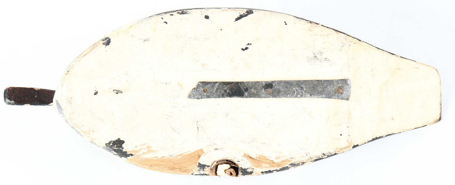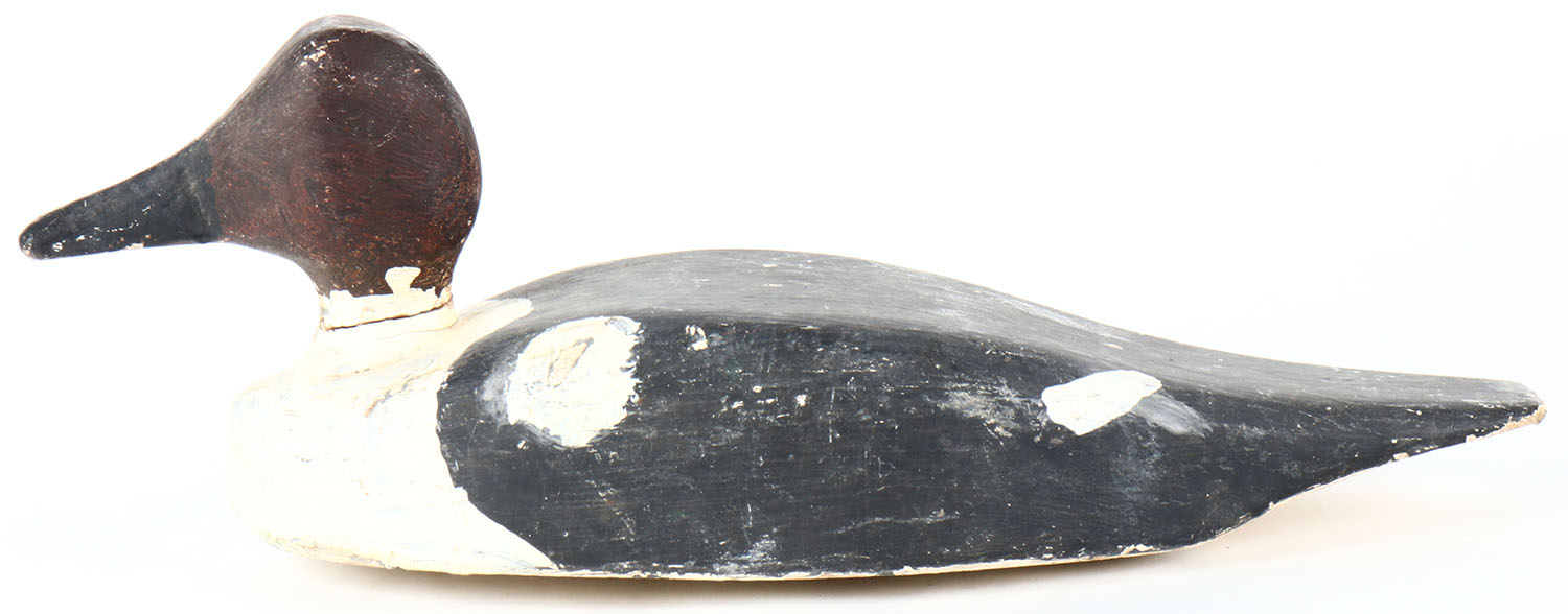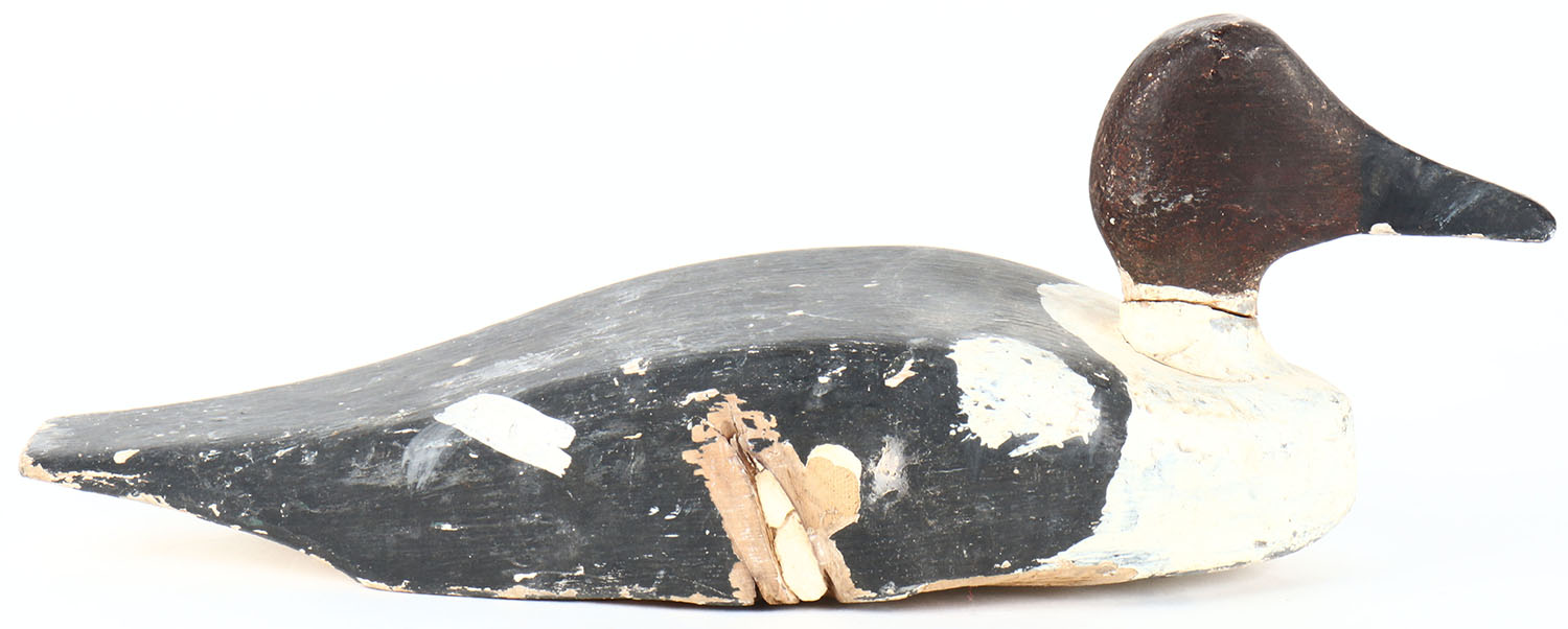 Goldeneye Hen by unknown maker, no eyes, solid wood, original paint, neck is broken, has crack on right side of body. Grade: Very Good - Value: 40 to 80