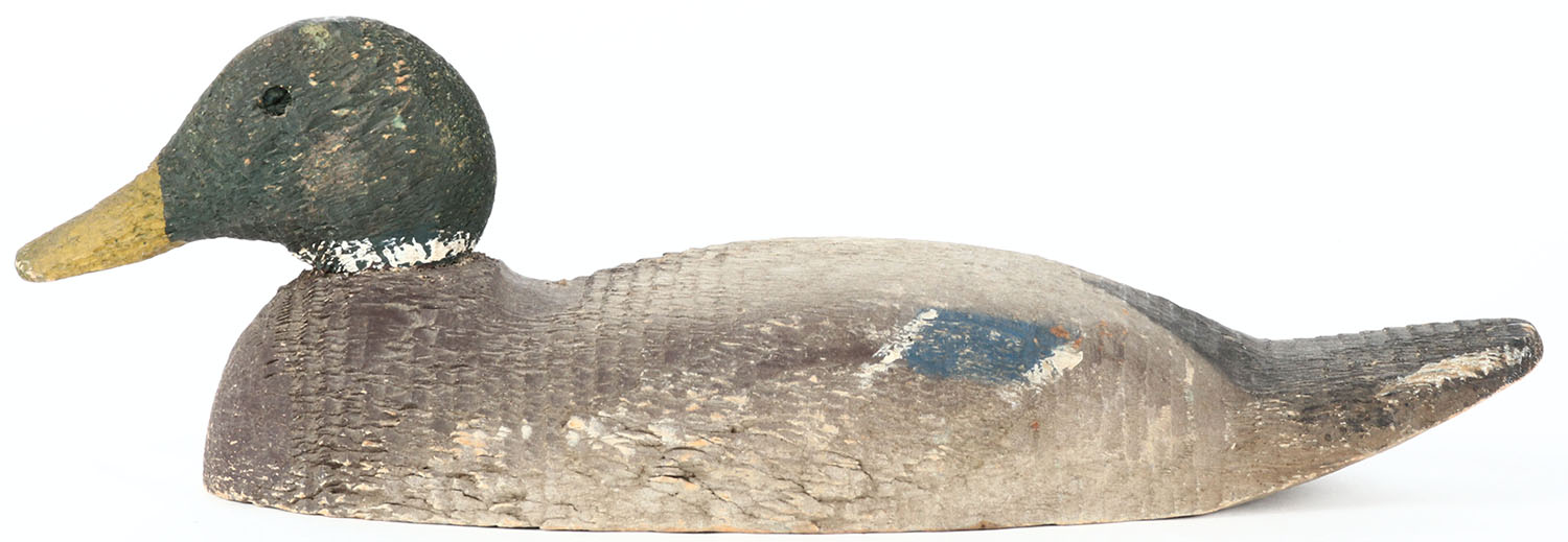 Mallard Drake by a Pascagoula, MS factory, glass eyes, one eye is missing, solid wood, original paint. Grade: Very Good + - Value: 20 to 40