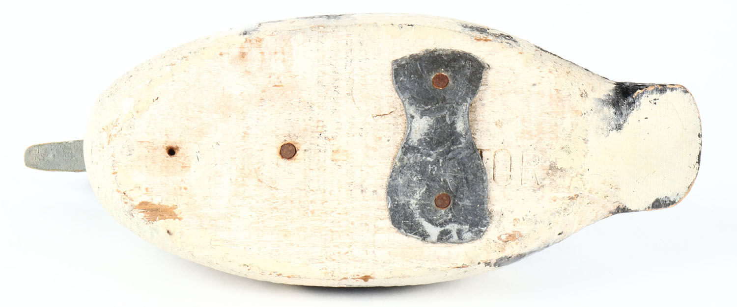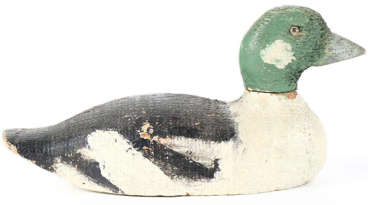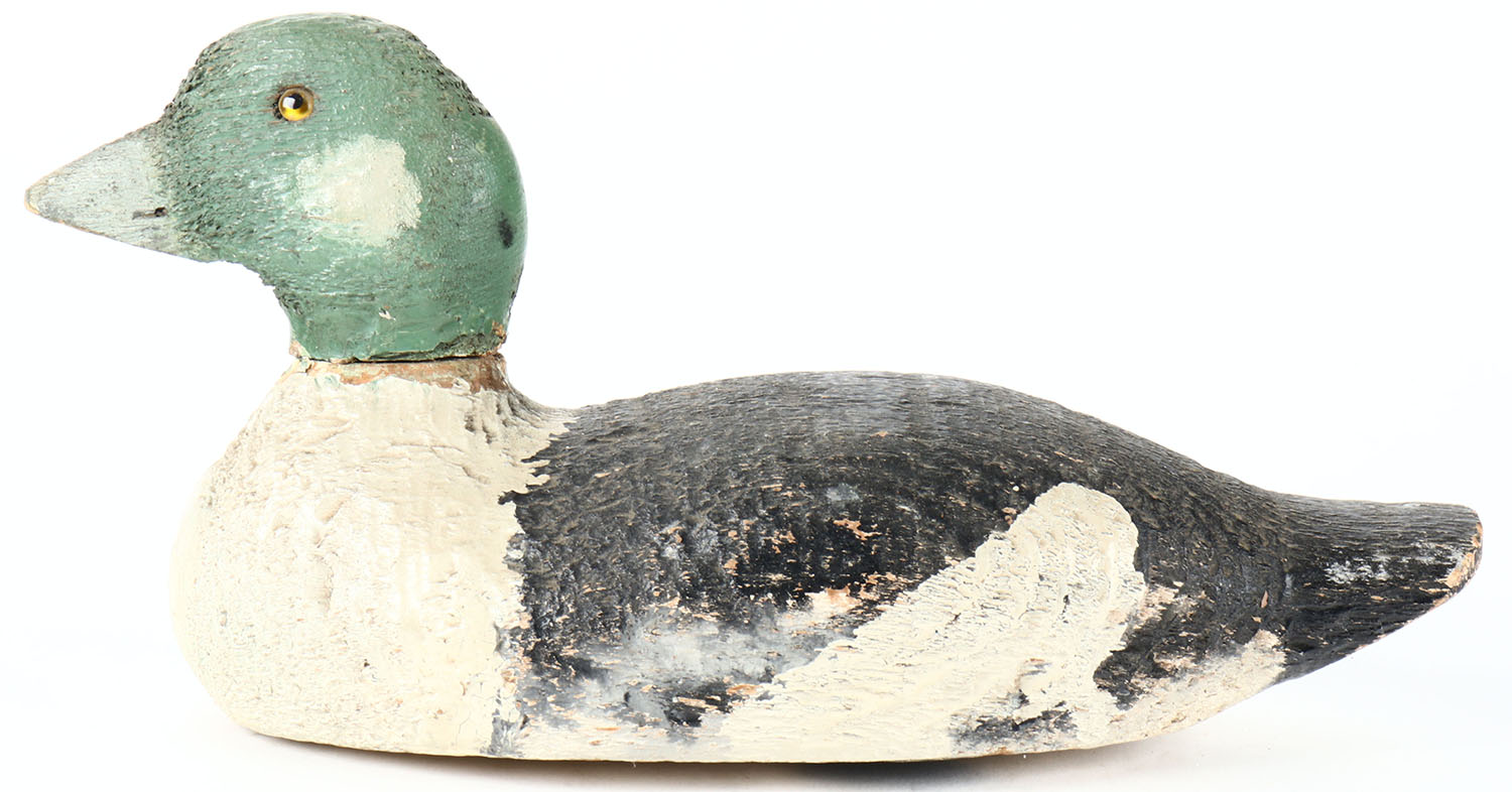 Goldeneye Drake by Victor Decoys, glass eyes, solid wood, old hunter repaint, head is slightly loose, maker hard stamp on bottom. Grade: Very Good - Value: 10 to 30