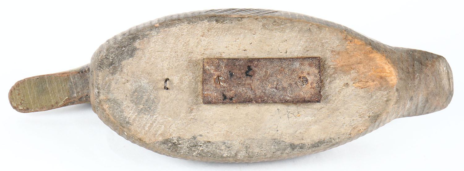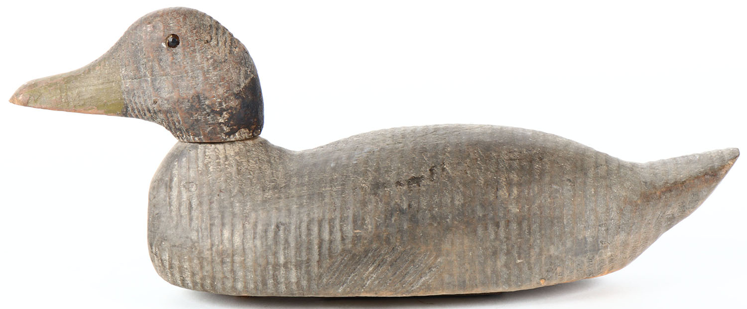 Black Duck by a Pascagoula, MS factory, glass eyes, solid wood, worn original paint, head is loose. Grade: Very Good + - Value: 10 to 30
