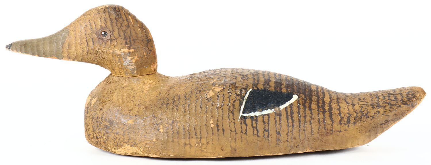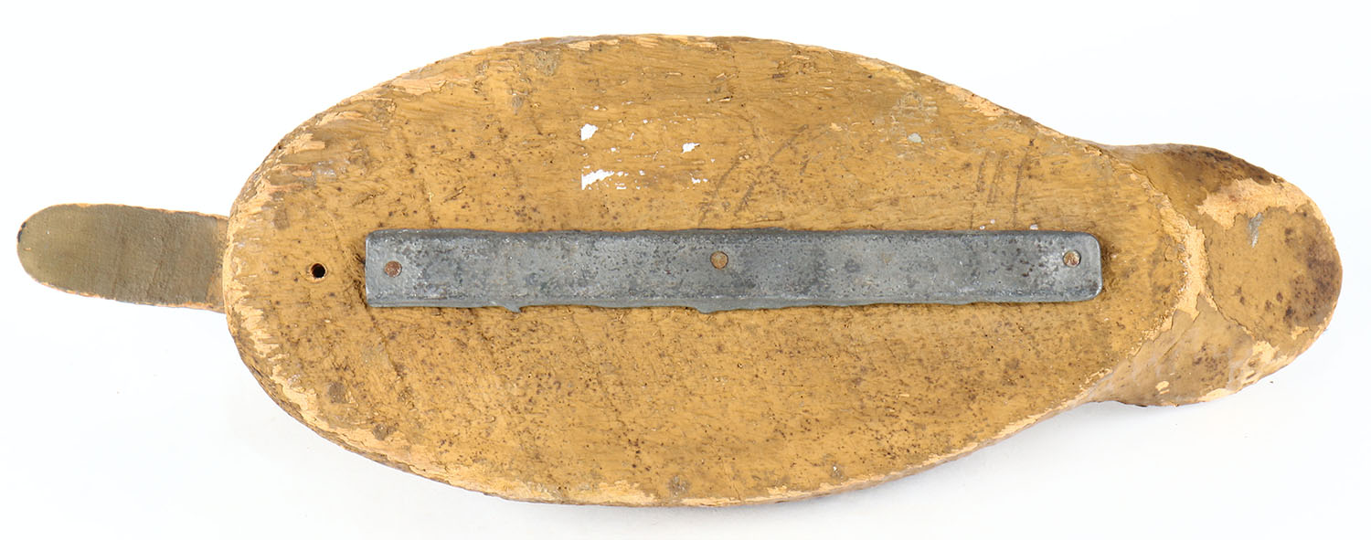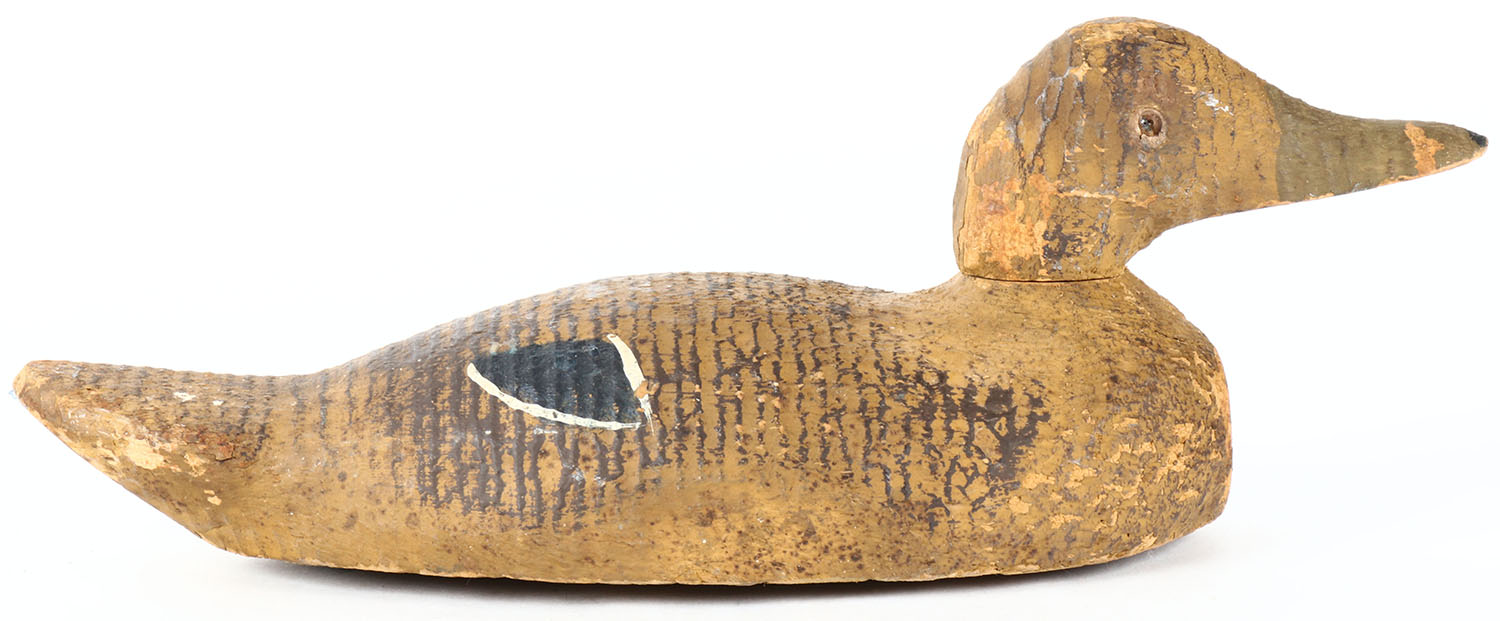 Black Duck by Padco, Pascagoula, MS, glass eyes, solid wood, original paint, head is loose, has age cracks under neck and on back. Grade: Very Good - Value: 20 to 40