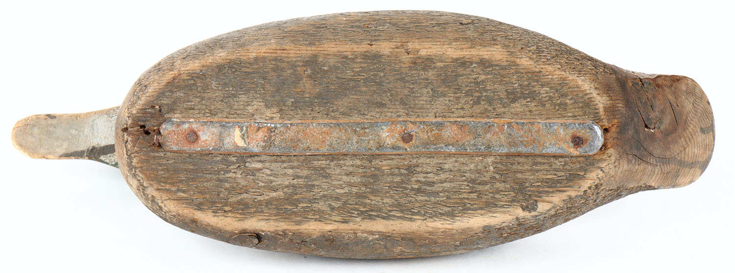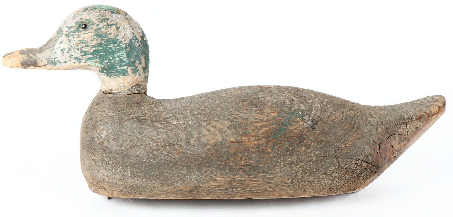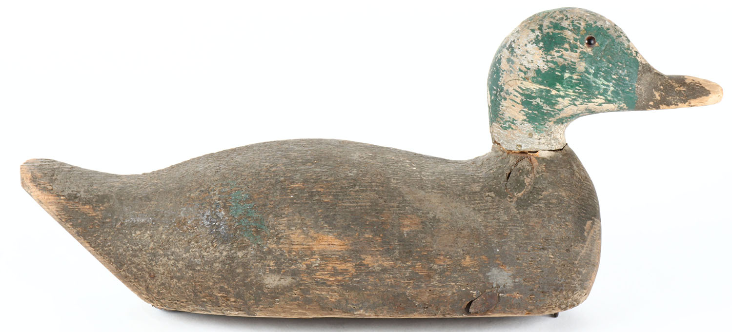 Mallard Drake by Animal Trap Company, Pascagoula, MS, glass eyes, solid wood, old hunter repaint, has age cracks on tail and under neck, head is loose. Grade: Very Good + - Value: 10 to 20