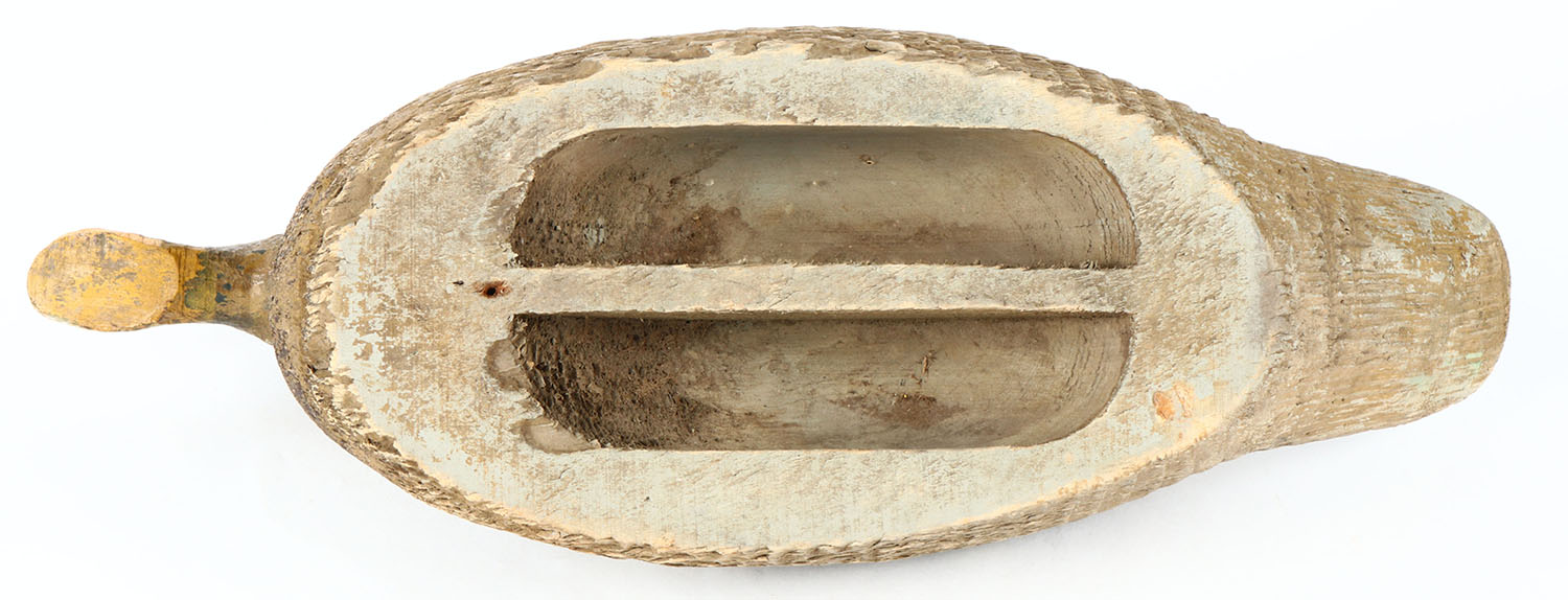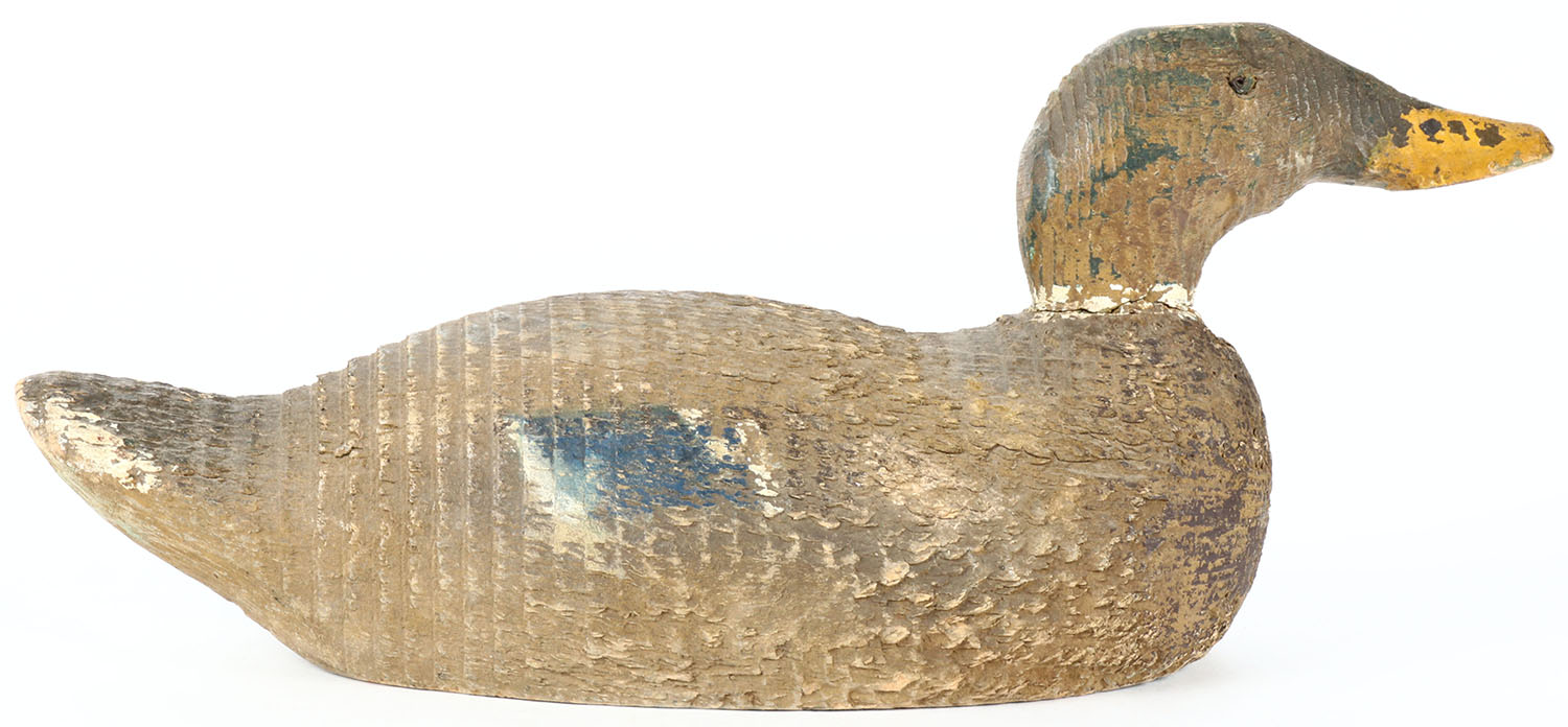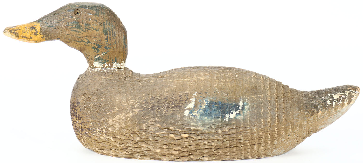 Mallard Drake by a Pascagoula, MS factory, eyes are missing, hollowed out body, original paint with most of the green missing from the head, neck has age cracks. Grade: Very Good - Value: 10 to 20