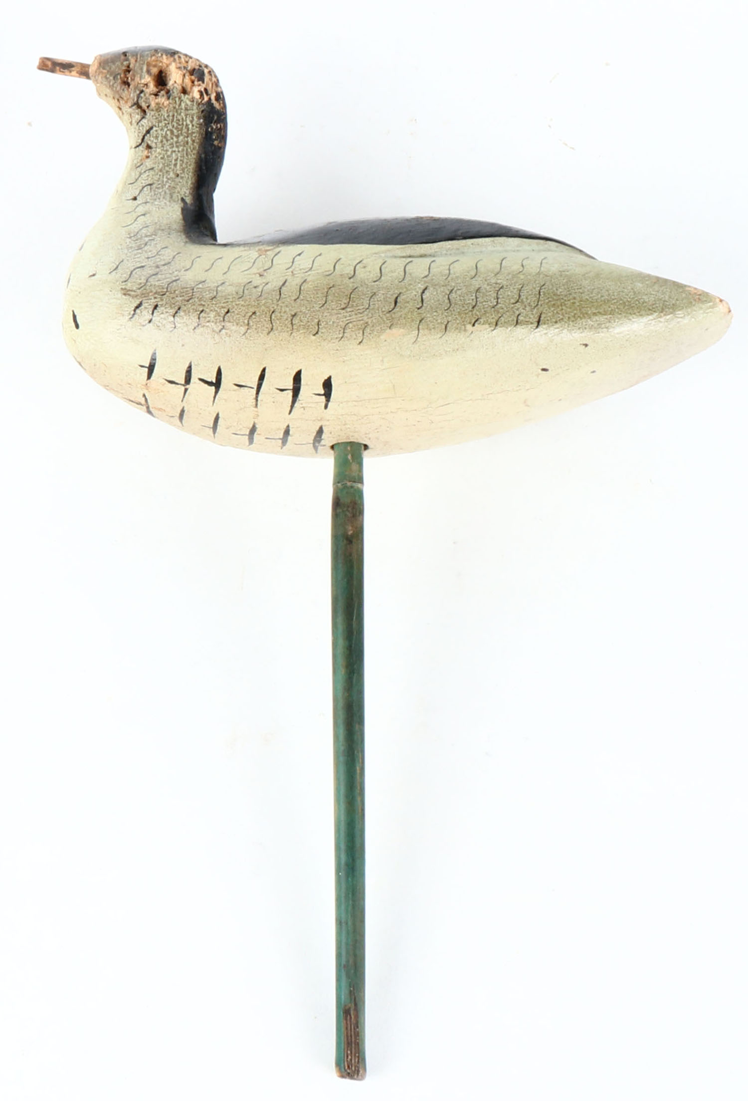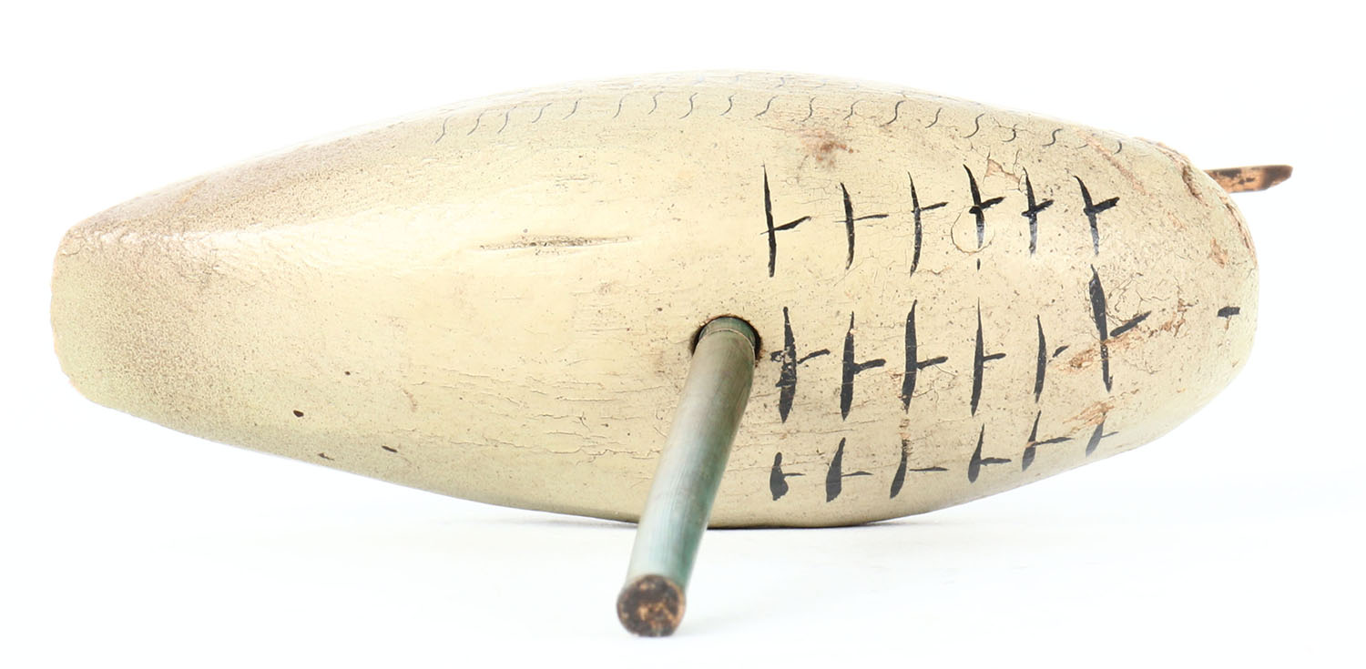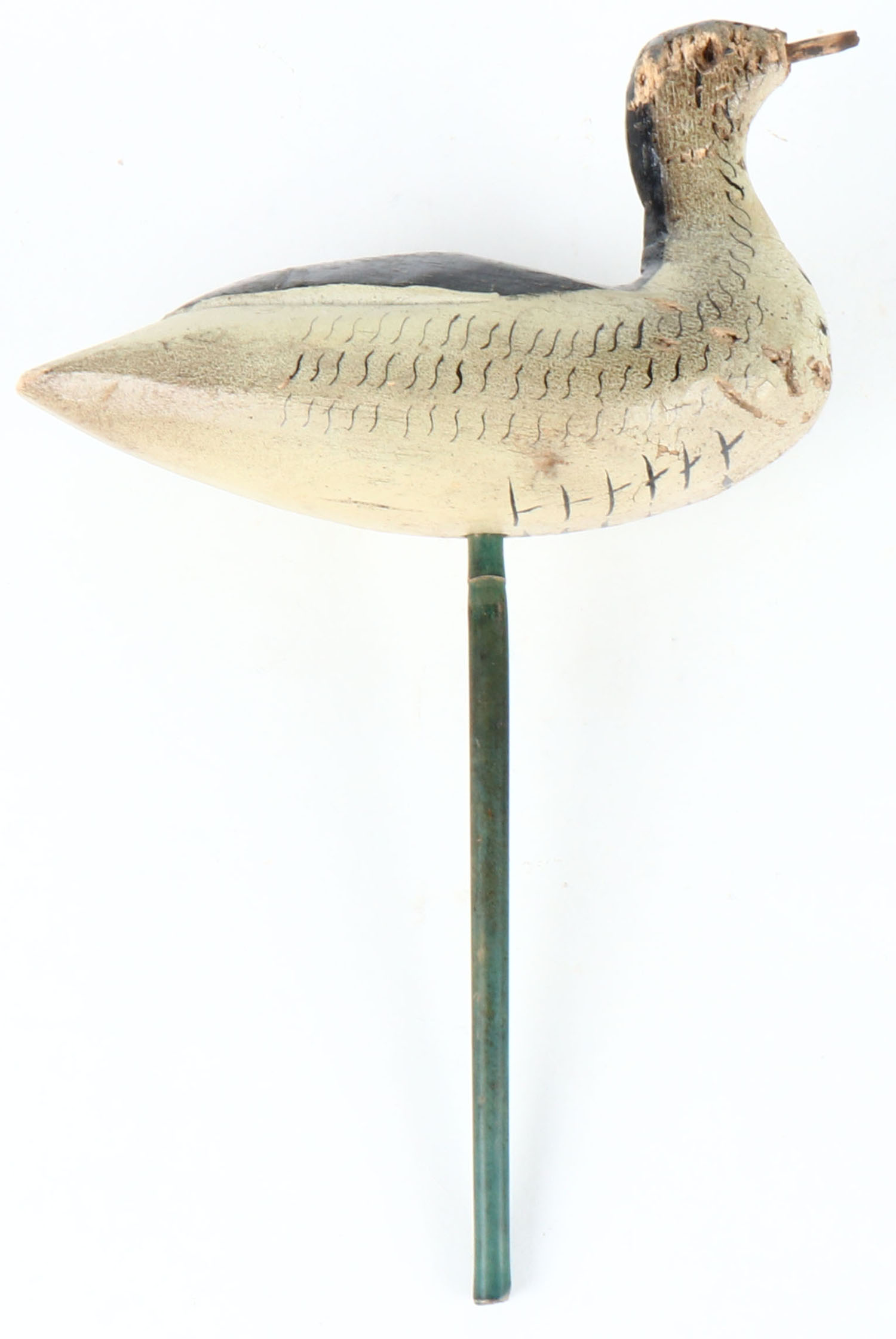 Shorebird by unknown maker, no eyes, solid wood, original paint, has shot marks to the face. Grade: Very Good - Value: 20 to 50