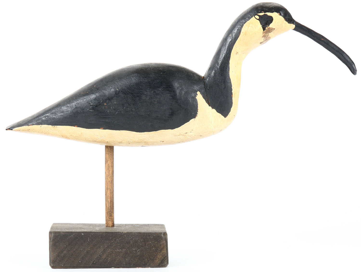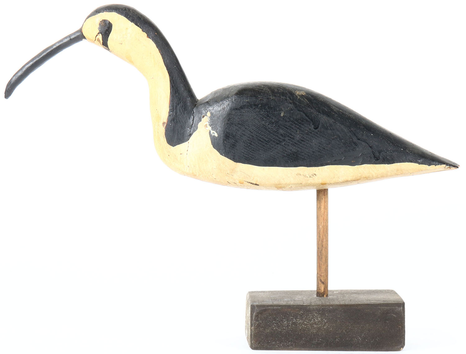 Shorebird by unknown maker, painted eyes, solid wood on wood stand, old hunter repaint, structurally excellent. Grade: Excellent - Value: 20 to 40