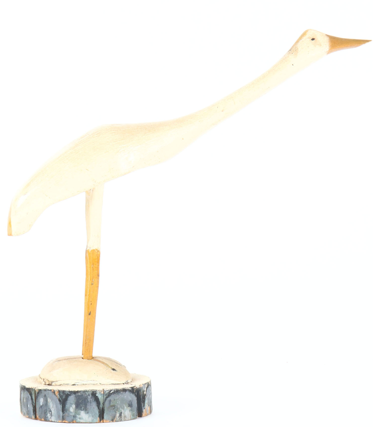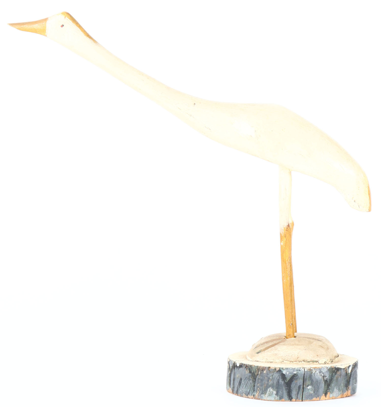 Sandhill Crane by unknown maker, painted eyes, solid wood on wood stand, original paint, structurally excellent. Grade: Very Good ++ - Value: 20 to 40