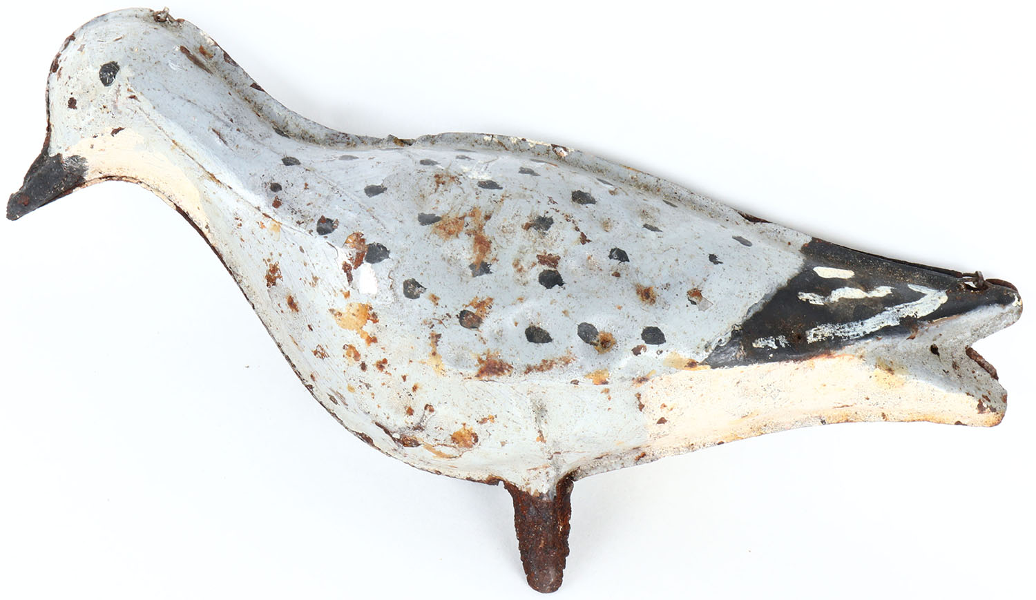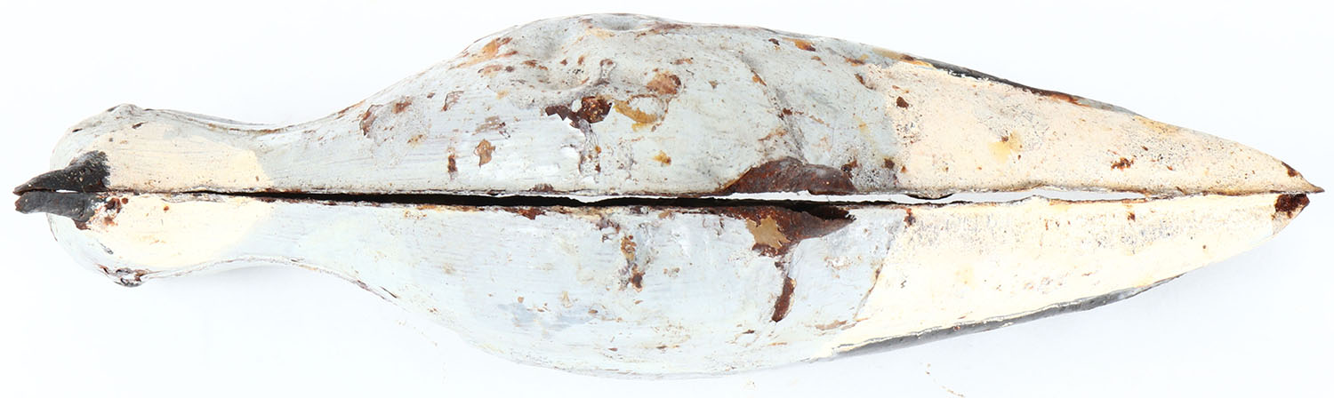 Metal 2pc Shorebird commonly referred to as Tinnies, Shorebird likely by WM. Read and Sons, competitor of Strater & Sohier, Boston MA, painted eyes, with wire hinges, original paint, 10'' OAL. Grade: Very Good ++ - Value: 50 to 80