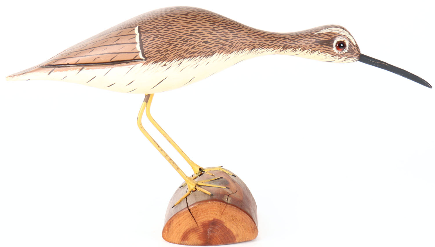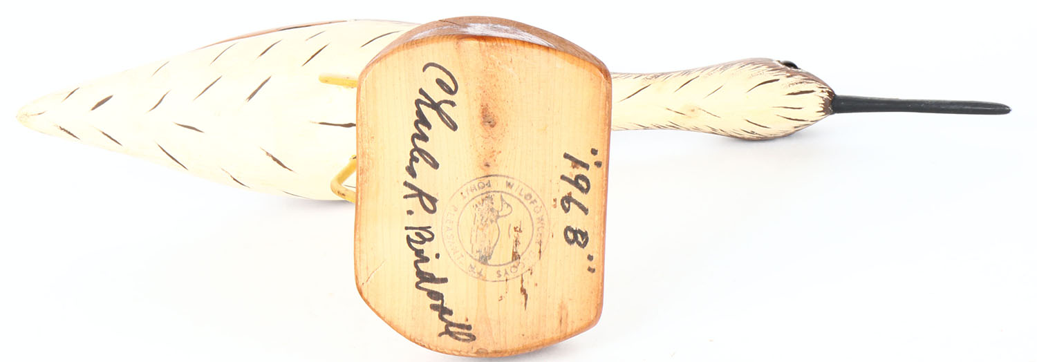 Shorebird by Wildfowler Decoys, Point Pleasant, NJ by Charles R. Birdsall, glass eyes, solid wood on wood stand, original paint, structurally excellent, stamped and signed on bottom. Grade: Excellent - Value: 50 to 100