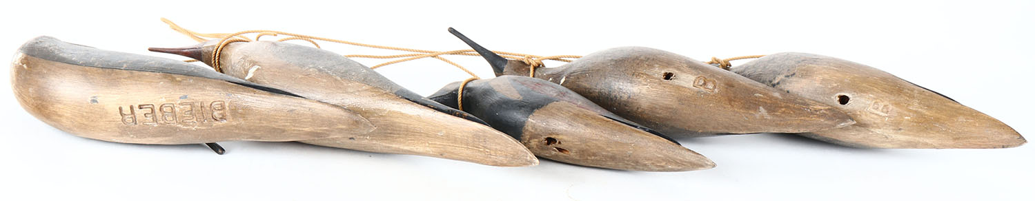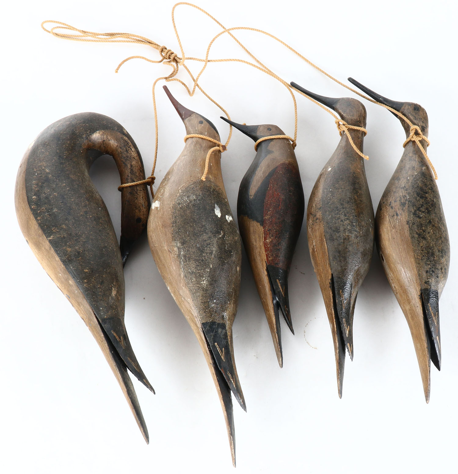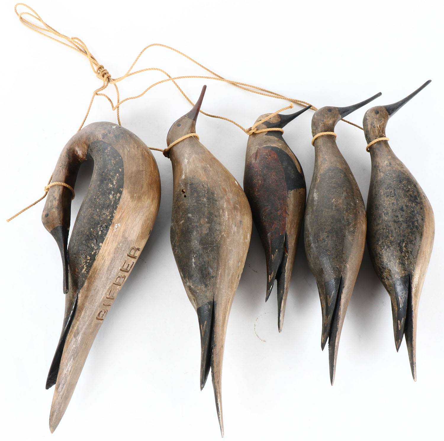 Lot of 5 shorebirds by Bruce Bieber, New Jersey, painted eyes, solid wood, original paint antiqued to look old, structurally excellent, hard brand by maker on bottoms. Grade: Excellent - Value: 250 to 500