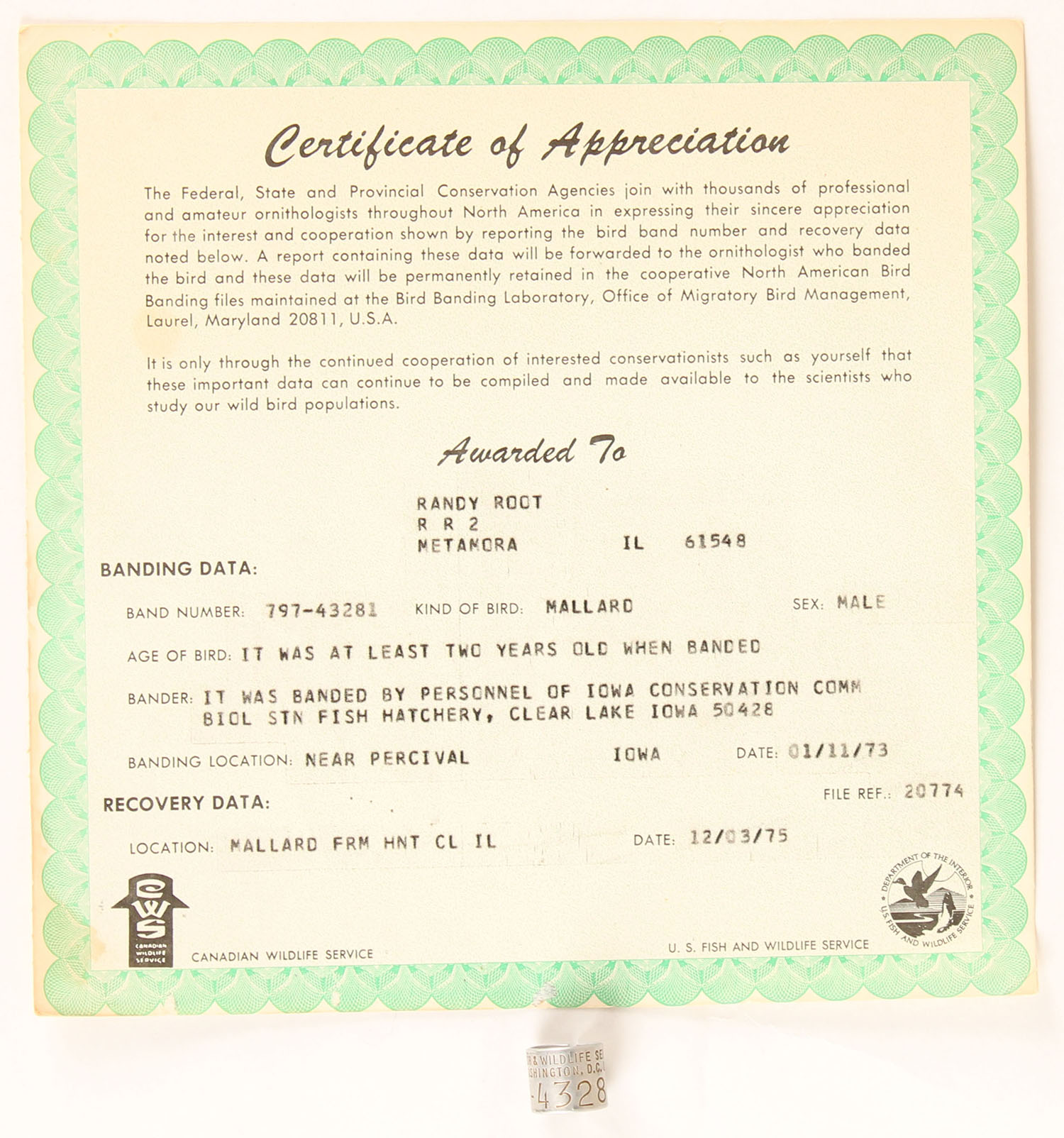 DUCK BAND with certificate from 1966, we are offering a few duck bands that were all shot at one duck club in Peoria IL from 1964 - 1999, ''MALLARD FARMS R R 2'', this one has a certificate, this one was banded in Near Percival Iowa 01/11/1973 and shot 12/03/1975. Grade: Excellent - Value: 30 to 100