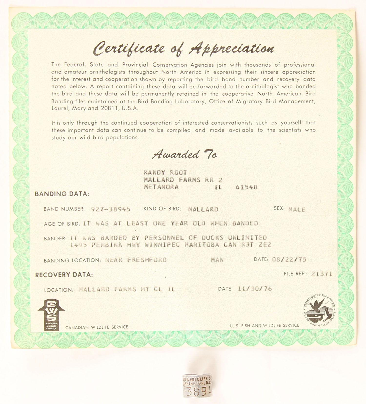 DUCK BAND with certificate from 1966, we are offering a few duck bands that were all shot at one duck club in Peoria IL from 1964 - 1999, ''MALLARD FARMS R R 2'', this one has a certificate, this one was banded in Near Freshford MAN 08/22/1975 and shot 11/30/1976. Grade: Excellent - Value: 30 to 100