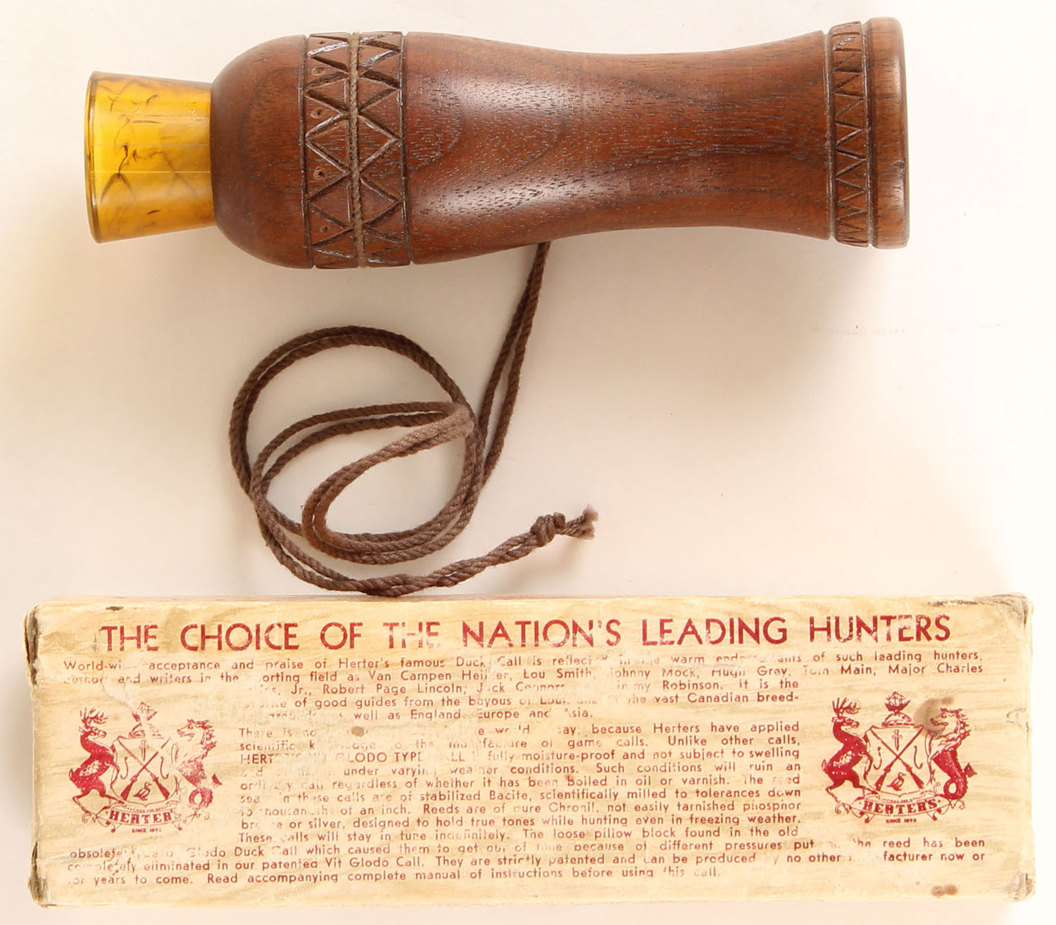 Herters Vit Glodo Type Duck Call in box, looks like someone did sone nice hand carving to wood barrel. Grade: Very Good - Value: 2 to 30