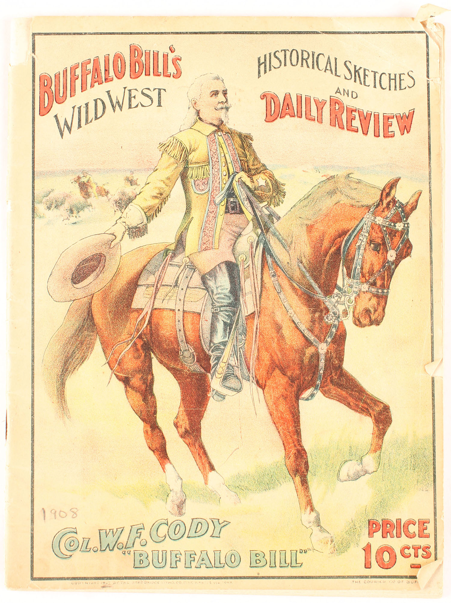 Buffalo Bill's Wild West Historical Sketches and Daily Review 1908, 9 9/16'' x 7 1/4''. Pages clean, staplebound, b/w images, front cover has some rips. Grade: Very Good + - Value: 10 to 100