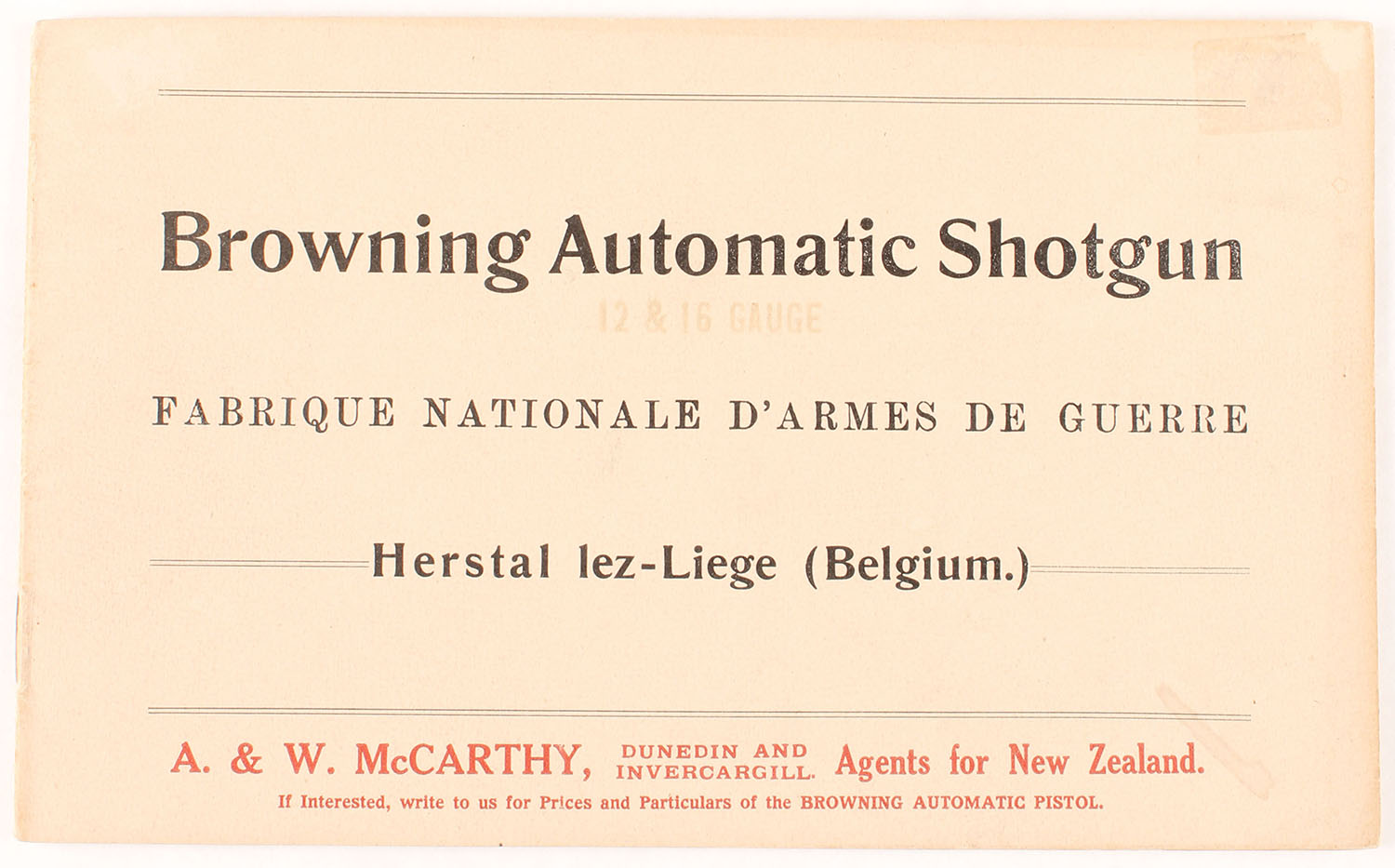 Browning Automatic Shotgun 12 & 16ga Manual 1903-1904, inside back cover, letter dated October 10, 1903, 8 3/4'' x 5 5/16'' 20 pages, pages clean, staplebound. Grade: Excellent - Value: 10 to 100
