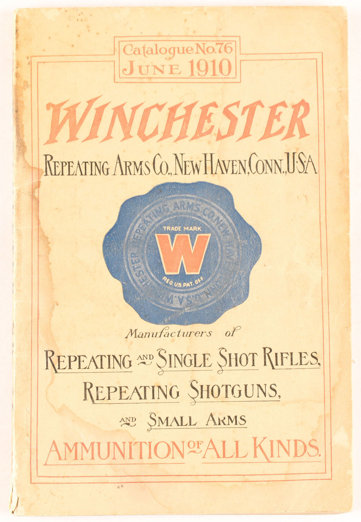Winchester Repeating Arms Co., Catalogue No. 76 June 1910, 5 1/2'' x 8 1/2''. 194 pages, pages clean, binding tight, papercover good with some stains. Grade: Very Good + - Value: 10 to 100