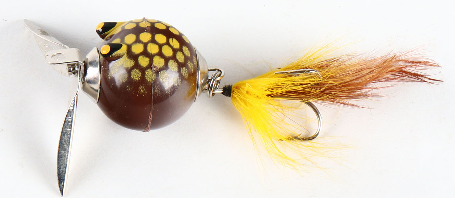 Worth Bait Co. Flutter Fin wood lure, PE, brown with yellow spots, has feather skirt & two front spinners. Grade: Excellent - Value: 10 to 50